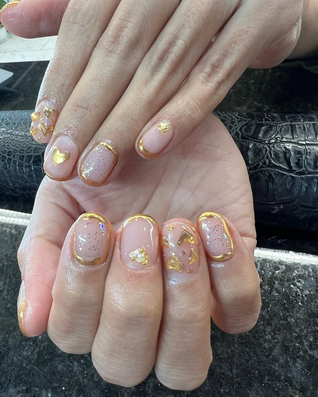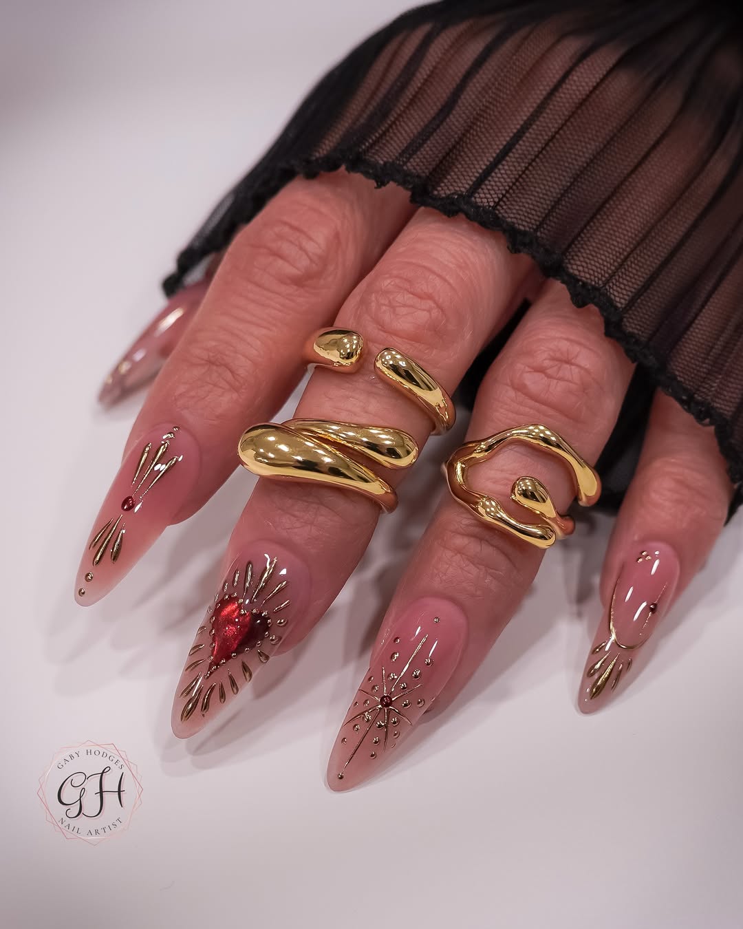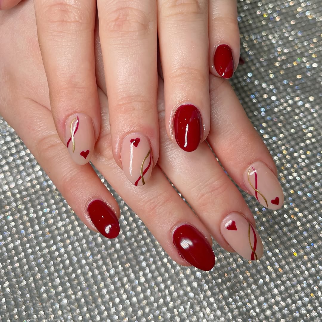 Gold chrome accents over soft nude bases create such a luxe Valentine vibe here. The metallic touches catch the light beautifully, making even the smallest heart detail feel intentional and rich. It’s understated but powerful—perfect for someone who wants romance with a polished, grown-up finish.