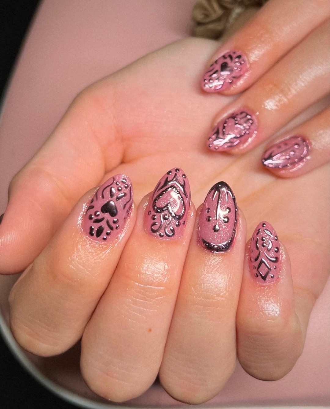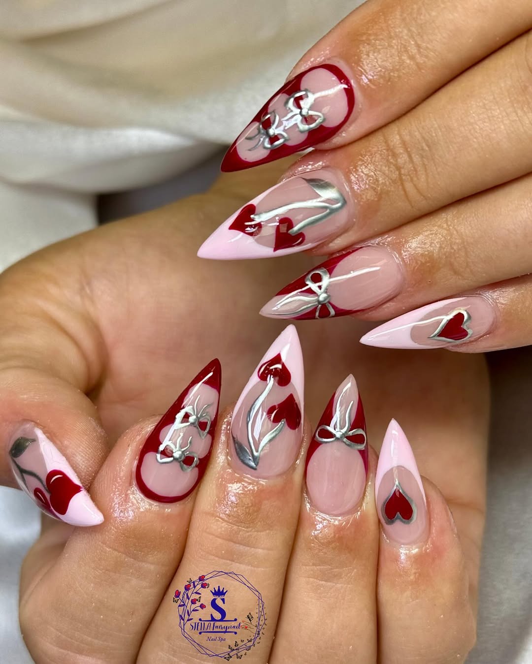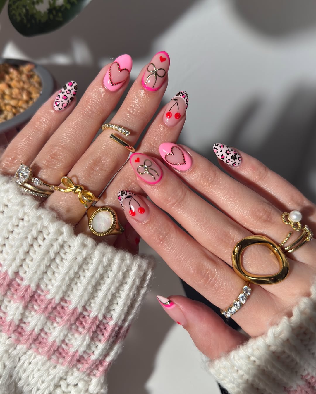This set is pure fun. Pink chrome, leopard accents, tiny bows, and hearts all living together—and somehow it works. It’s bold but balanced, playful without feeling chaotic. If Valentine’s Day to you means leaning fully into the cute side of love, this manicure gets it. Maximal, flirty, and impossible to ignore.