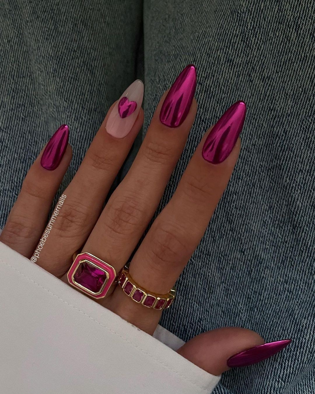 Now this is a statement. High-shine chrome paired with punchy heart accents gives this set a confident, fashion-forward edge. It’s glossy, bold, and impossible to ignore. These nails don’t whisper Valentine’s Day—they announce it. Ideal for anyone who believes love should be loud, shiny, and a little bit dramatic.