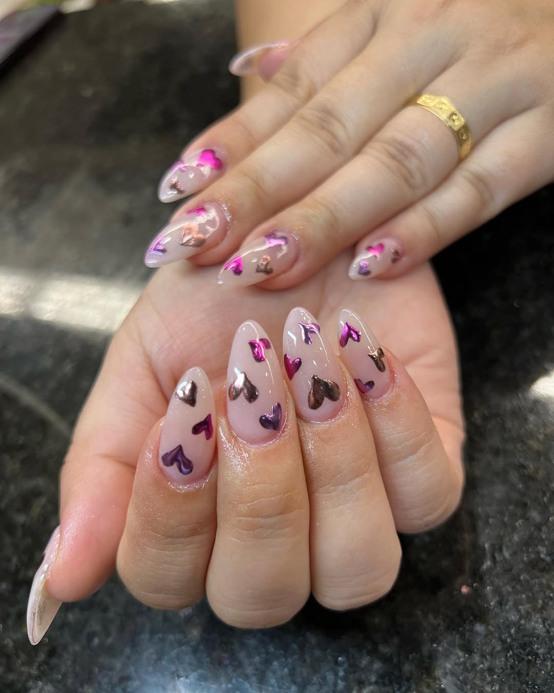 This version leans even more into texture and shine. The chrome hearts feel dimensional, almost jewelry-like, sitting perfectly against sheer, glossy bases. It’s romantic without being overly sweet, bold without being loud. The kind of nails that make people ask, “Where did you get those done?”