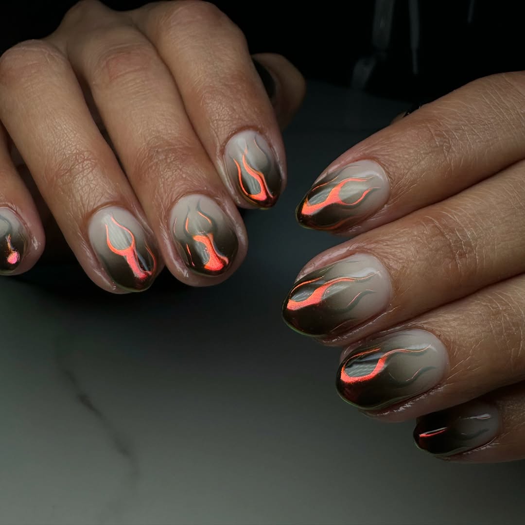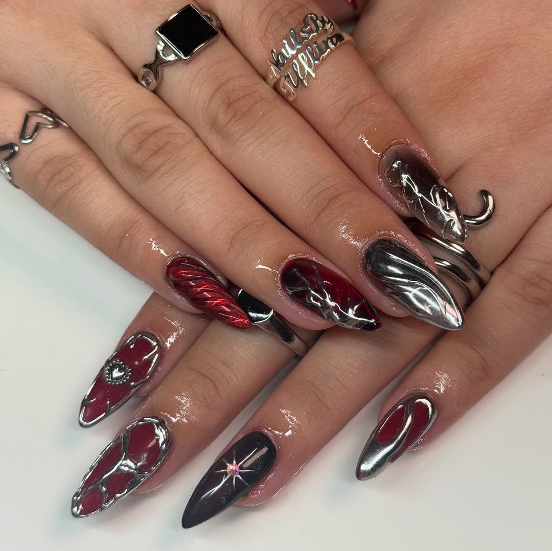 This set doesn’t whisper — it stares back. Deep tones, molten chrome details, and that slightly dangerous energy that feels intentional, not chaotic. Every nail looks like it has its own personality, but somehow they all still belong together. It’s bold without being messy, edgy without trying too hard. The kind of nails that don’t need an outfit plan — they are the plan.