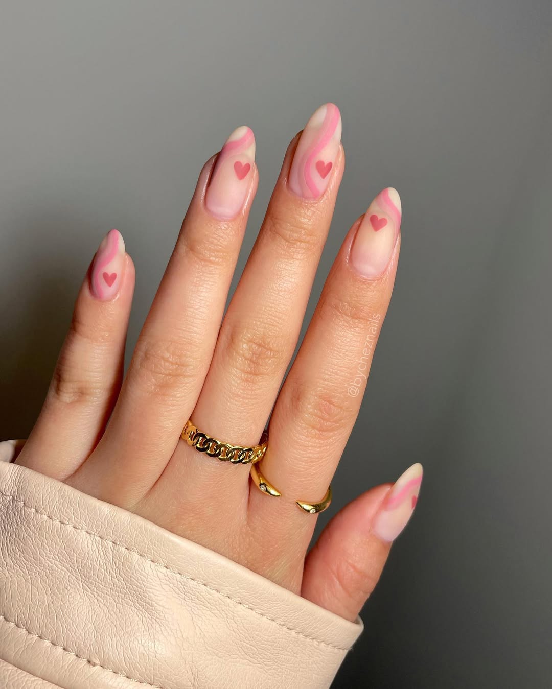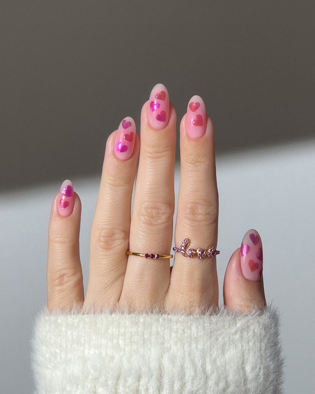 These nails are proof that you don’t need to overdo Valentine’s Day to make an impact. The soft pink base with subtle chrome accents and tiny hearts feels clean, polished, and quietly flirty. It’s that effortless kind of cute—the kind that looks just as good holding a coffee as it does wrapped around a bouquet. Low-key romantic, high-key classy.