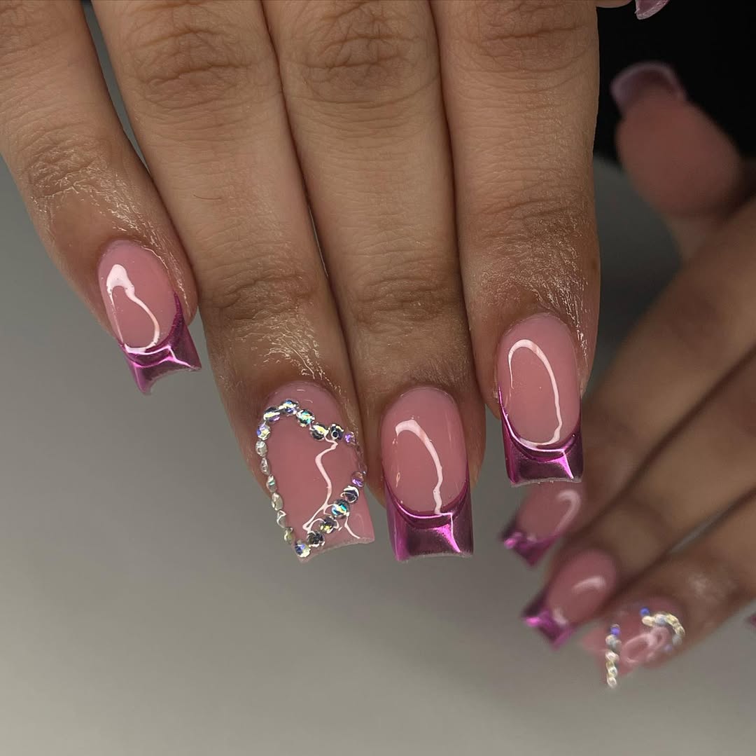 A modern French moment, but make it Valentine-approved. The soft sculpted tips paired with delicate heart details feel refined and intentional, with just enough chrome glow to catch the light. This set feels like a love letter written in cursive—timeless, elegant, and never trying too hard. Perfect if your vibe is romantic but grown.