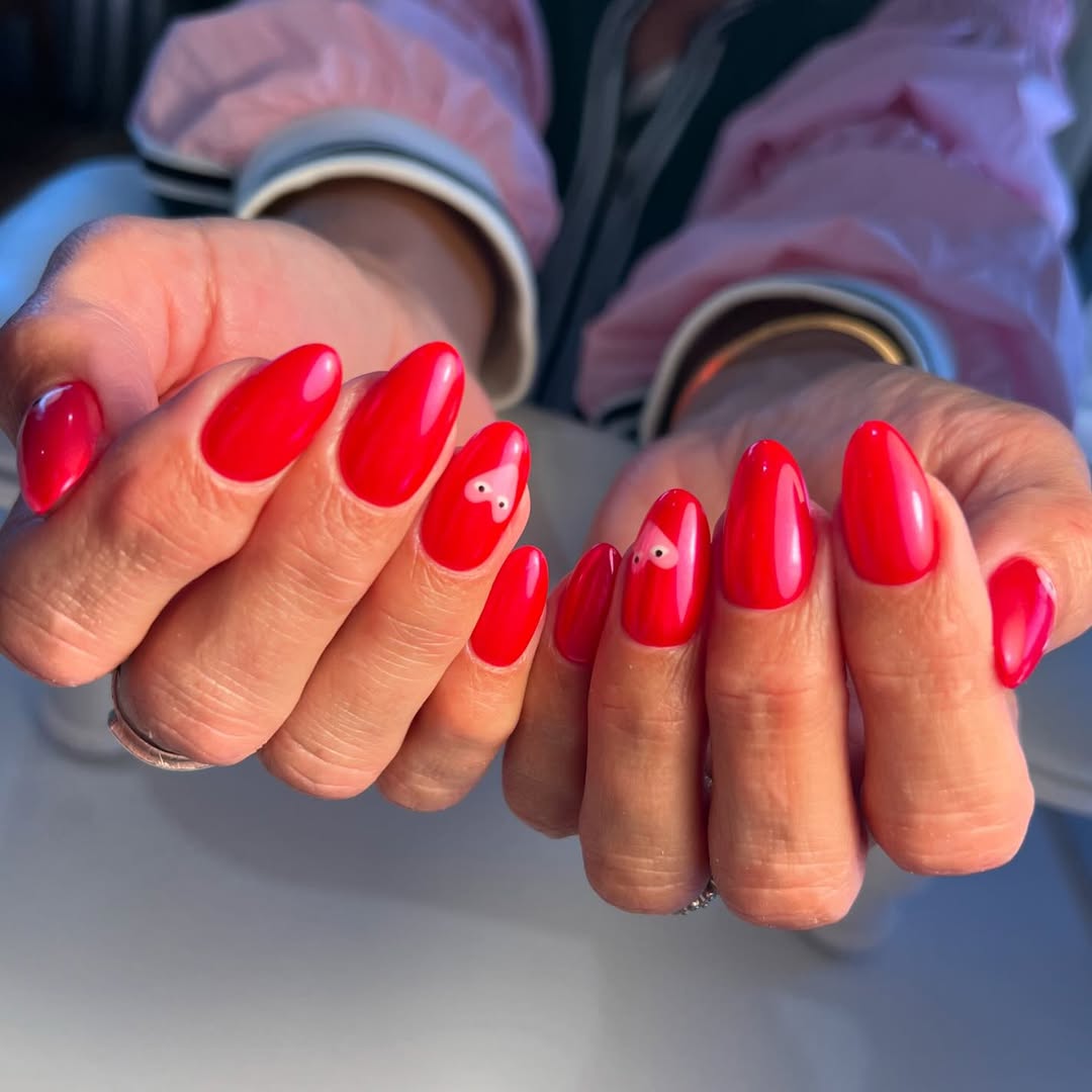 This set is pure Valentine drama in the best way. The sharp almond shape paired with reflective chrome hearts feels bold, confident, and unapologetically extra. It’s giving “main character on Feb 14,” especially with that glossy nude base letting the metallic red do all the talking. What really works here is the balance—romantic but not soft, edgy without going cold. These are the nails you wear when you don’t just celebrate Valentine’s Day, you own it.