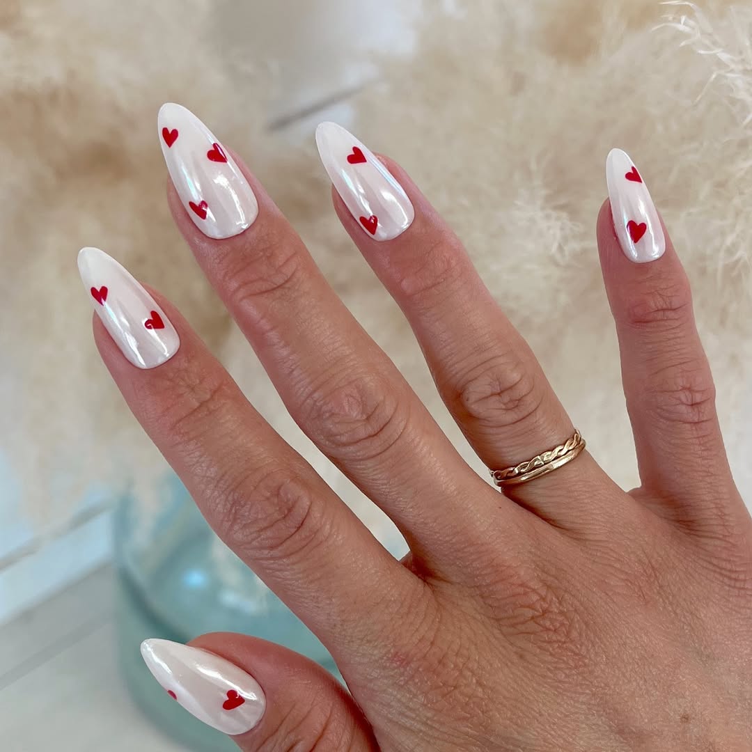 There’s something so charming about white chrome paired with scattered red hearts—it feels clean, airy, and quietly romantic. The shine is subtle, almost pearl-like, letting the heart details do the talking without shouting. This is the kind of manicure that works with everything. Cozy sweaters, gold rings, soft makeup—no styling stress required.