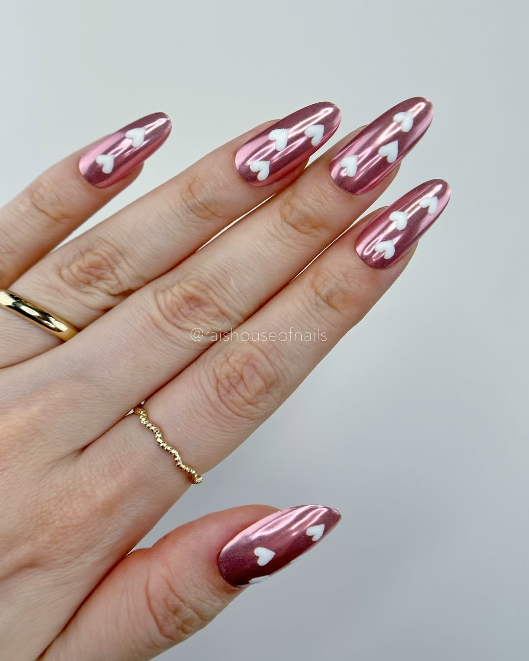 This look leans into dreamy Valentine energy with a delicate base and soft chrome details that glow rather than glare. The hearts feel sweet and playful, almost floating on the nail. It’s giving cozy sweaters, handwritten notes, and quiet moments. Perfect if your idea of Valentine’s Day is more about feeling than flexing.