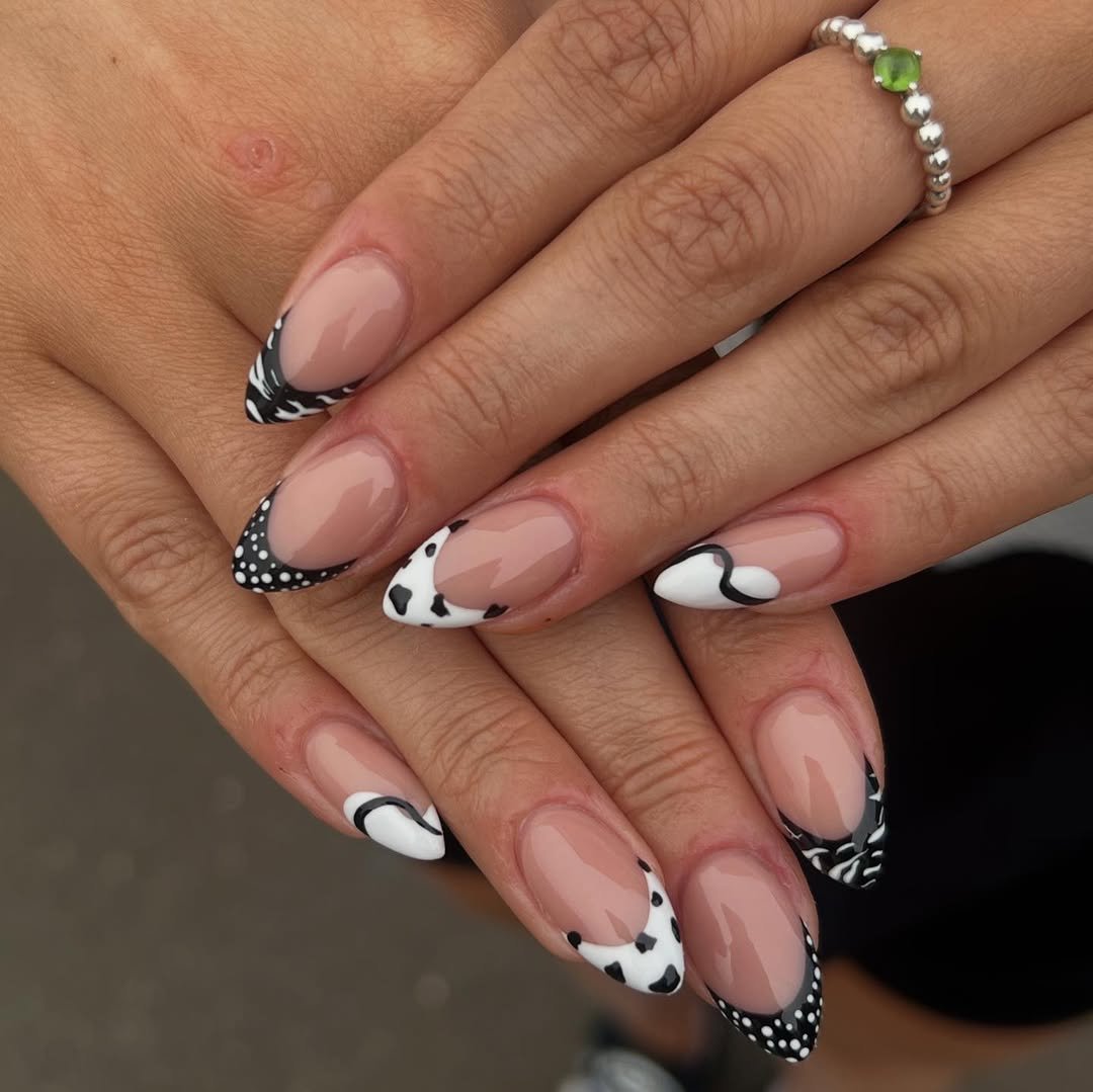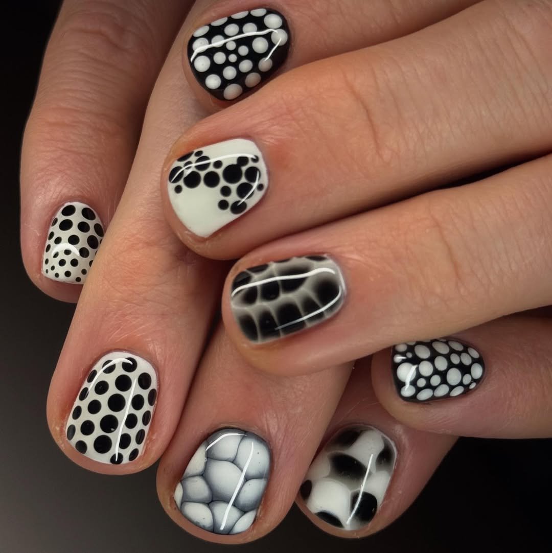 This design celebrates variety, featuring elements like cow print, polka dots, and abstract lines. Each nail offers a distinct design while remaining cohesive within the clean black and white palette.
