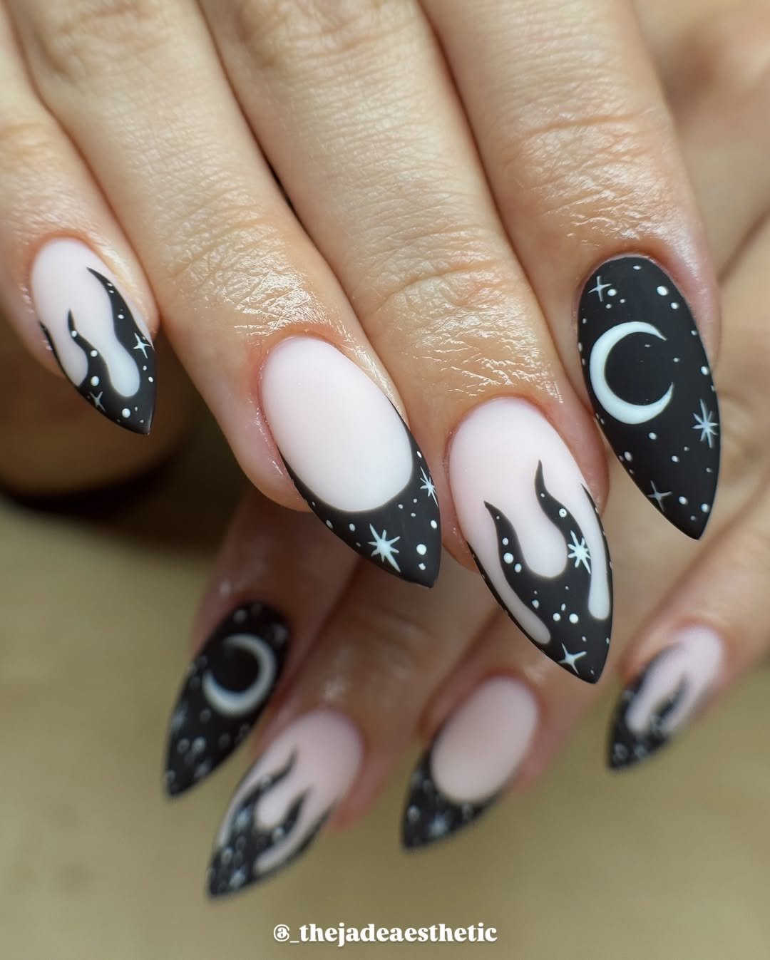 This design evokes the mystical allure of a starlit sky. A matte nude base complements black, flame-like tips, delicate stars, and a crescent moon accent, creating a dreamy and enigmatic aesthetic.