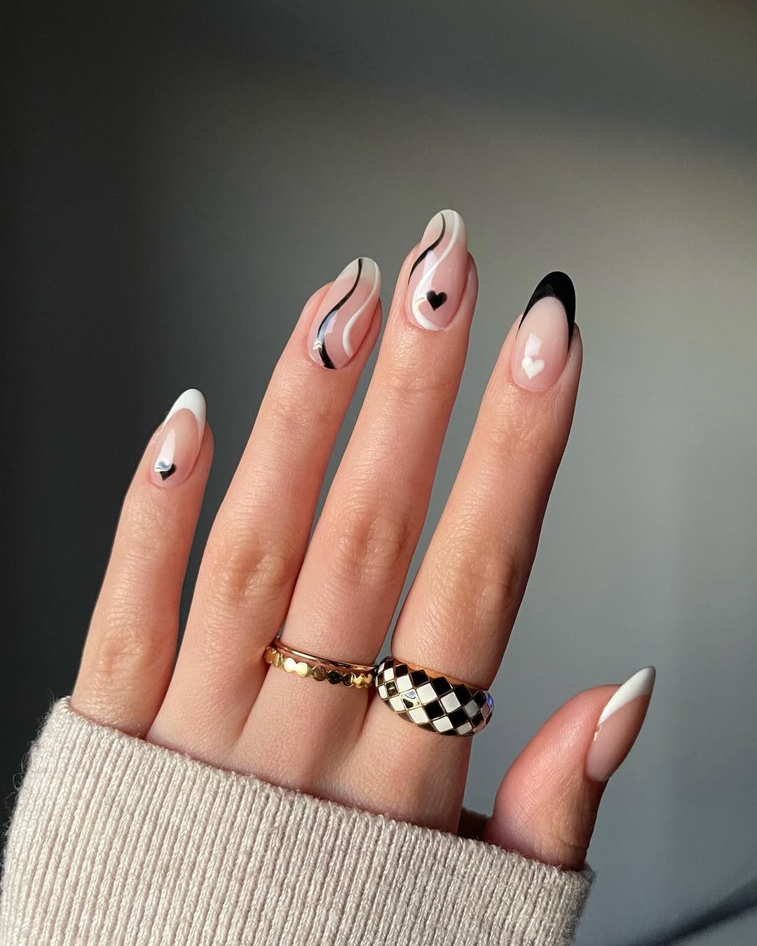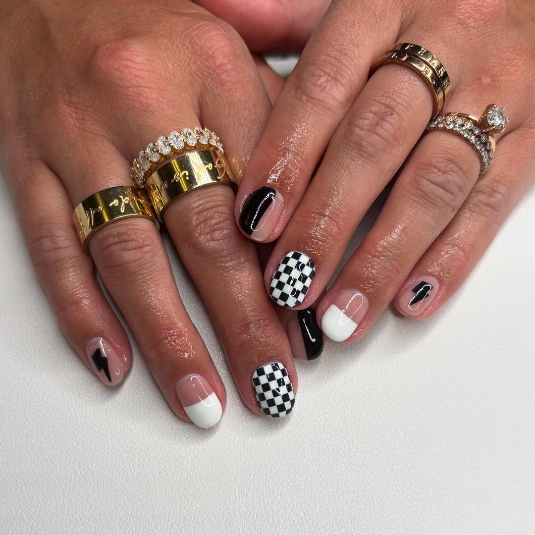 This design merges classic patterns with a modern sensibility. Checkerboard accents, solid black nails, and clean white tips create a harmonious yet visually engaging composition.