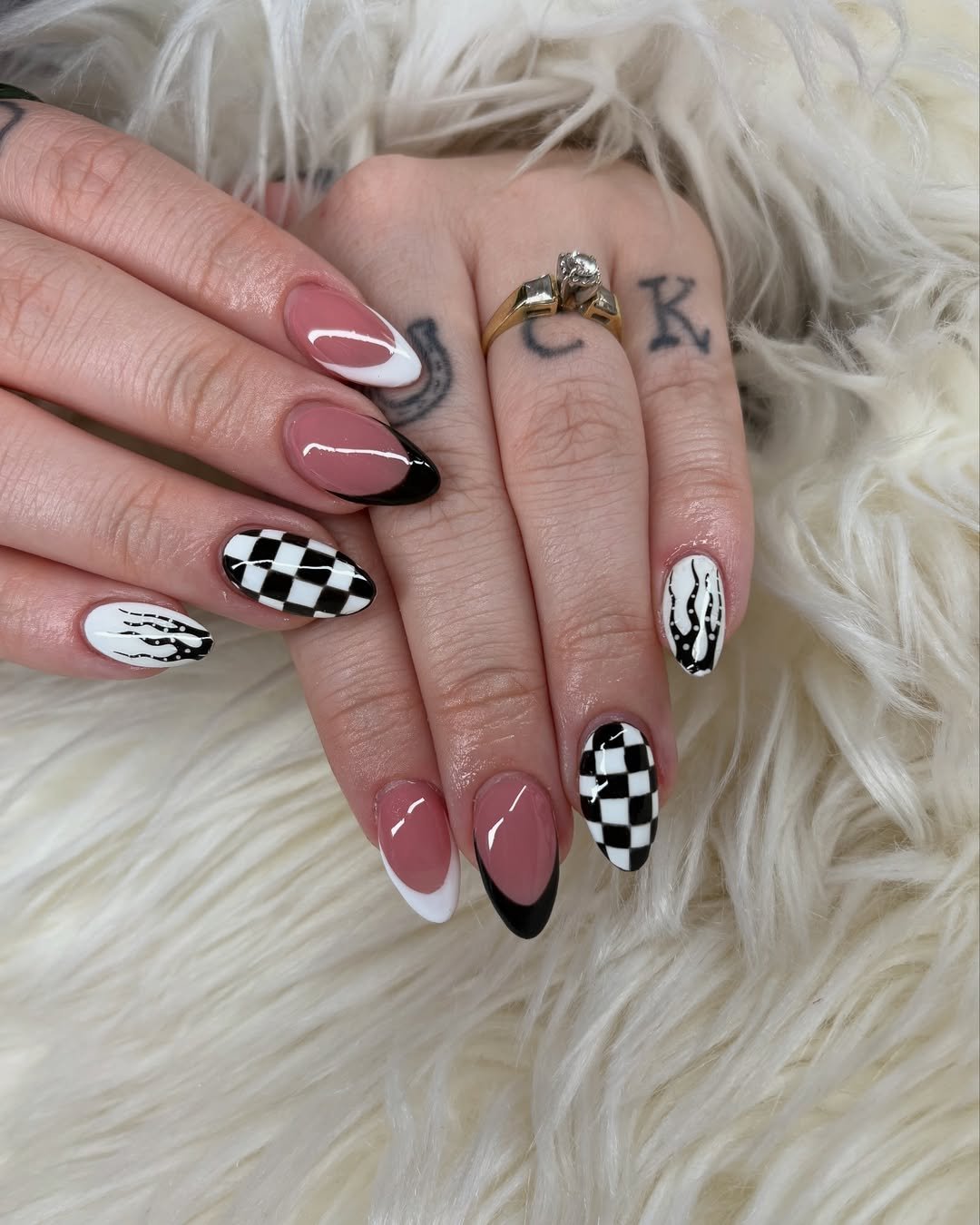 This design exudes undeniable cool-girl appeal. The combination of checkerboard patterns, flame motifs, and sleek French tips offers a bold yet wearable look, anchored by a neutral base.