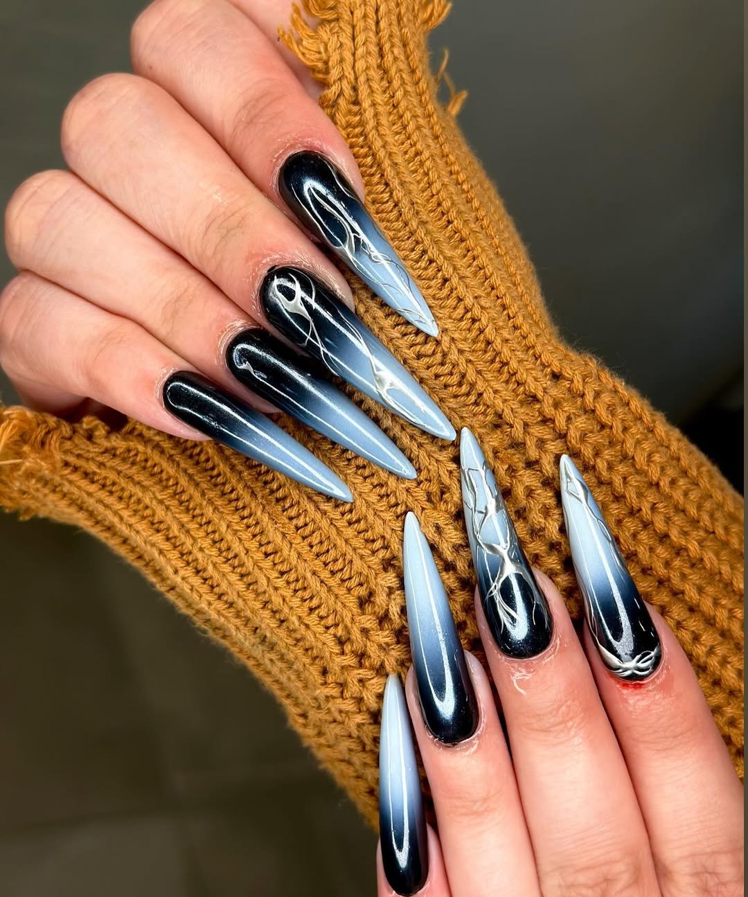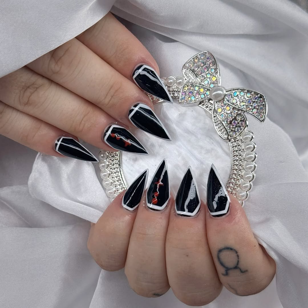The pointed nail shape amplifies the dramatic effect of each design, making this a perfect choice for those who appreciate attitude in their nail art.