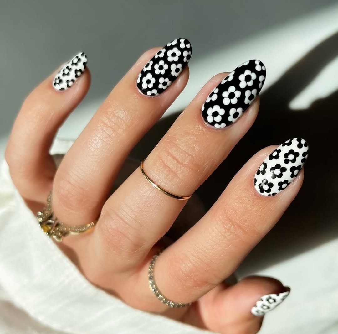 Concluding with a soft and sweet design, these black and white daisy nails offer a playful, fresh, and charmingly nostalgic feel. Alternating base colors add interest without overcomplication.