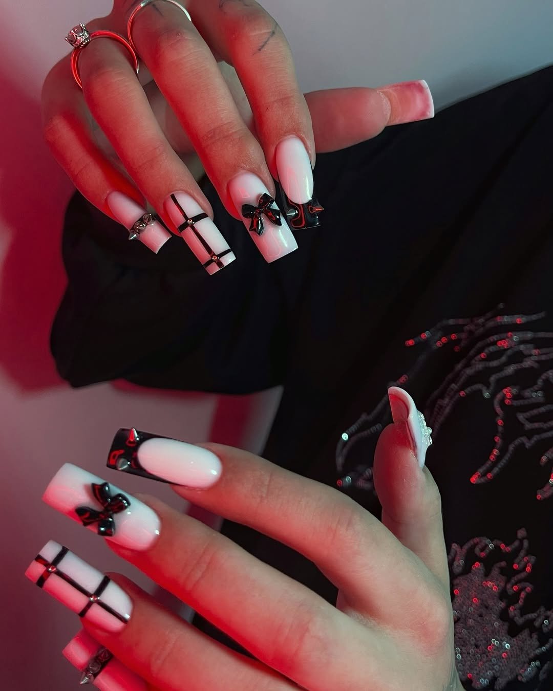 This set embraces a bold and slightly unconventional aesthetic. The sharp black and white contrast is enhanced by 3D bows and stud detailing, lending a high-fashion, editorial quality.