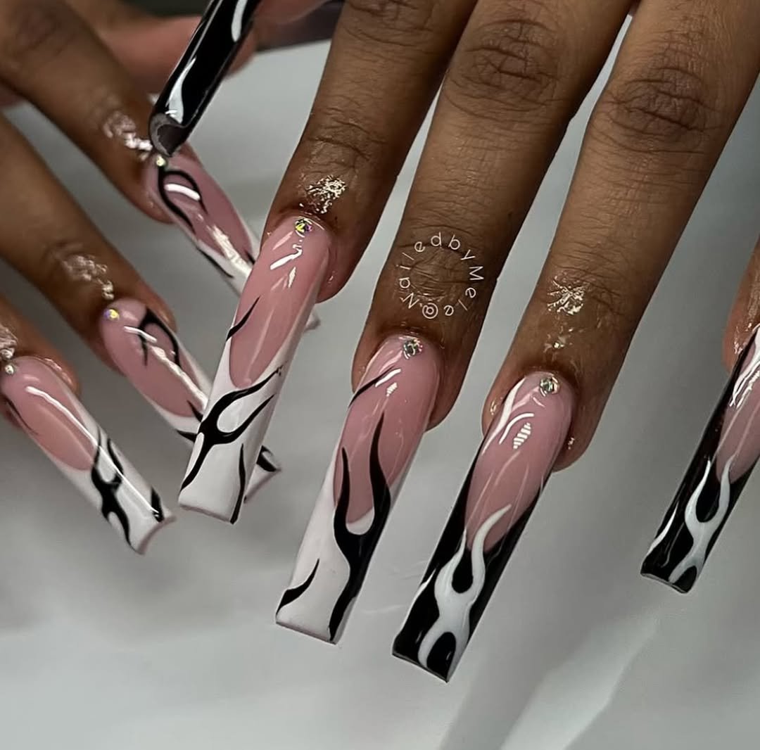 These nails bring a fiery intensity. Black flame tips overlaying a soft nude base create a bold, high-contrast effect that is edgy yet refined.