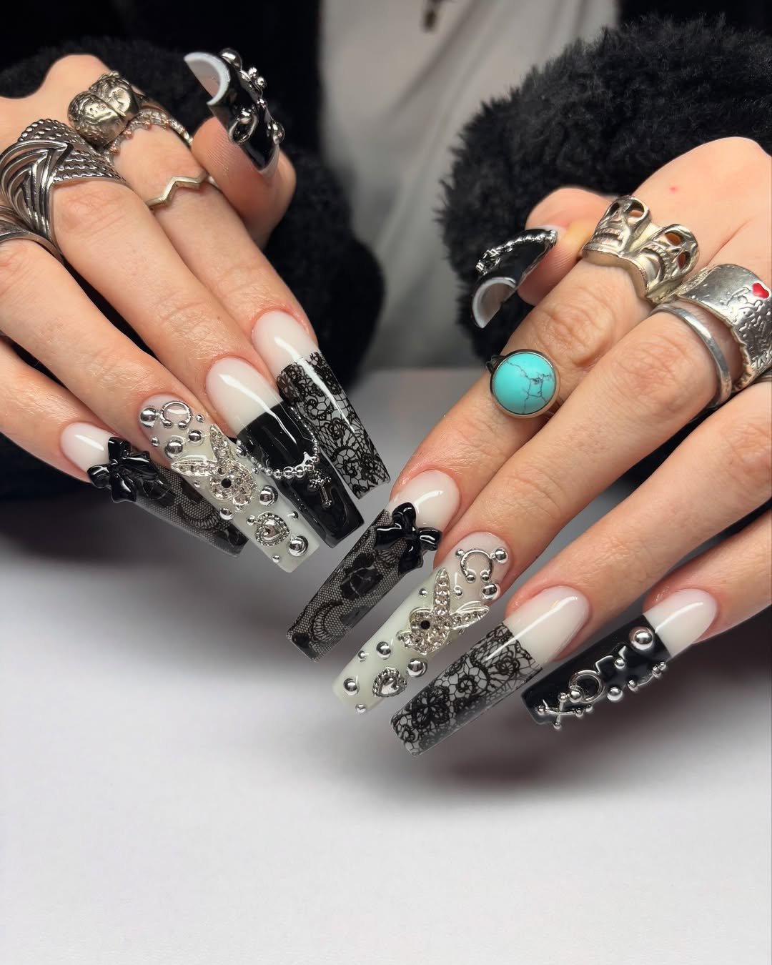 This set embodies boldness through intricate detailing, featuring lace-inspired patterns, metallic embellishments, and three-dimensional accents that exude statement-making energy. It masterfully blends high-fashion aesthetics with a dark, romantic sensibility.