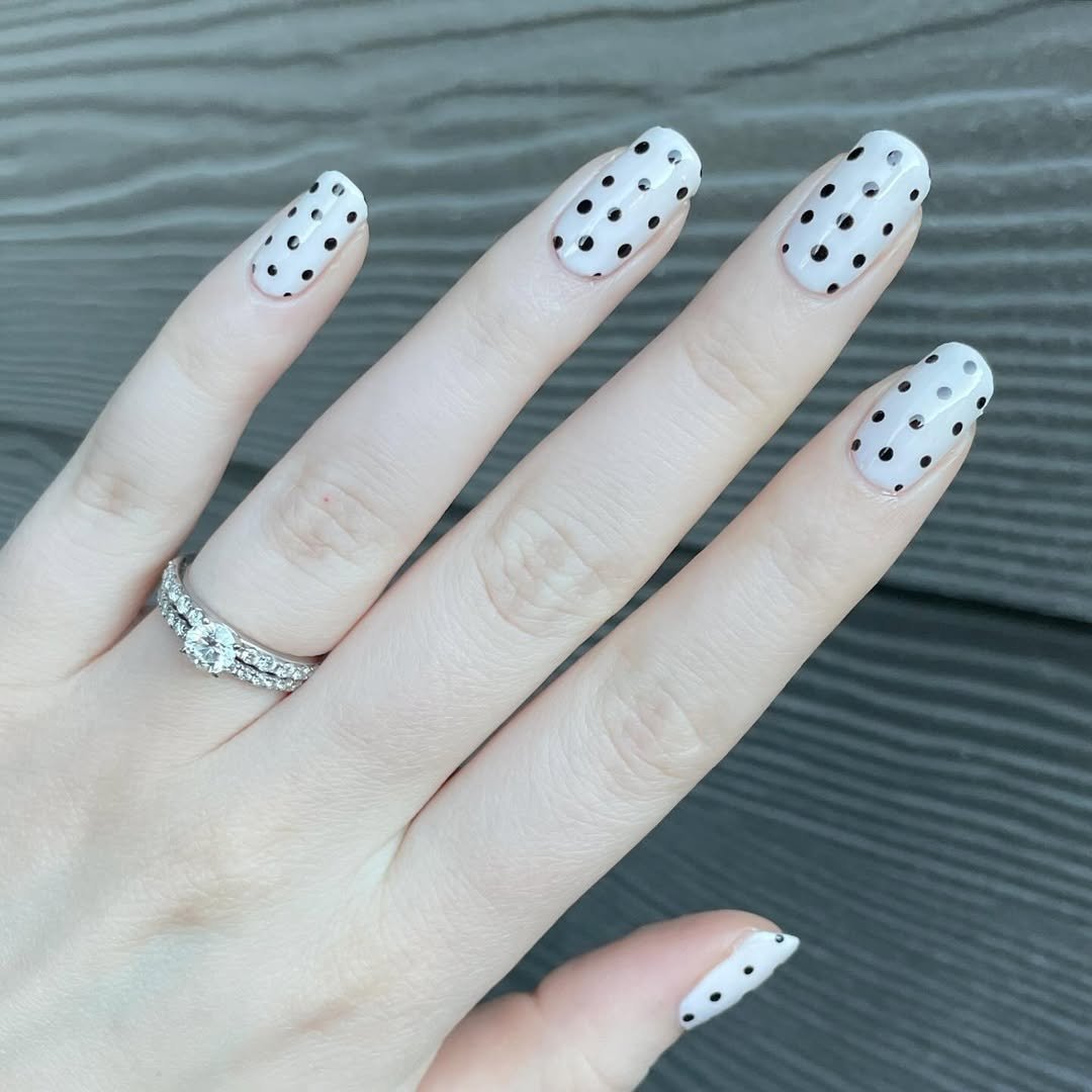 This set demonstrates the versatility of polka dots. A blend of soft nude, crisp white, and bold black creates a playful contrast, while varying dot sizes add visual dynamism. It’s a cute design with an underlying edge.