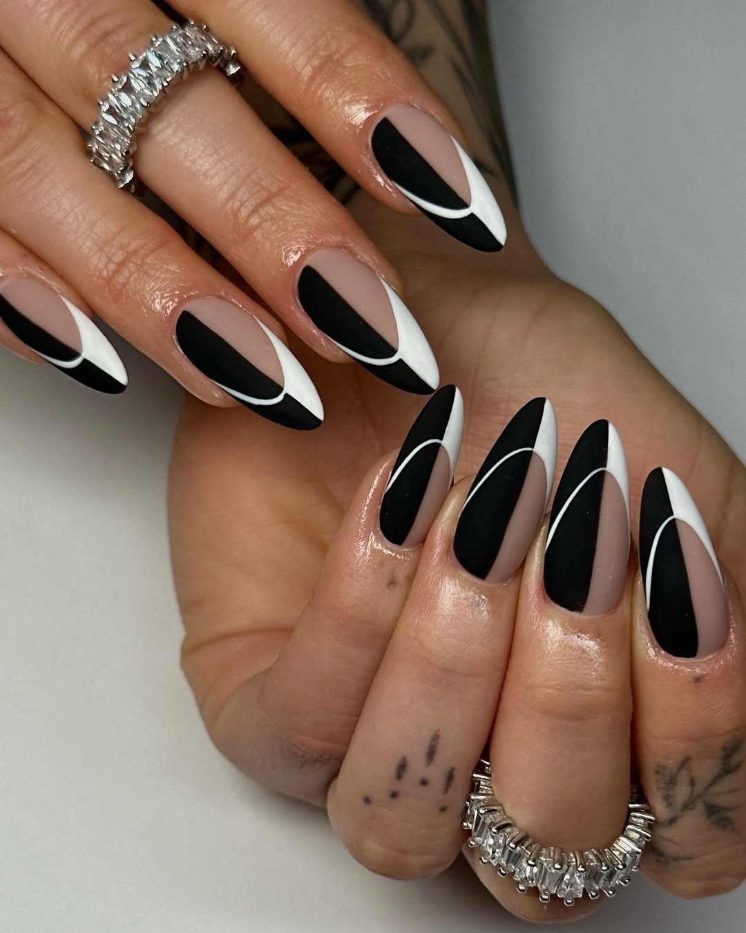This set focuses on precision and fluid lines. Matte black against a soft nude base creates a sharp contrast, further enhanced by curved white lines that artfully guide the eye across each nail for a satisfying visual flow.