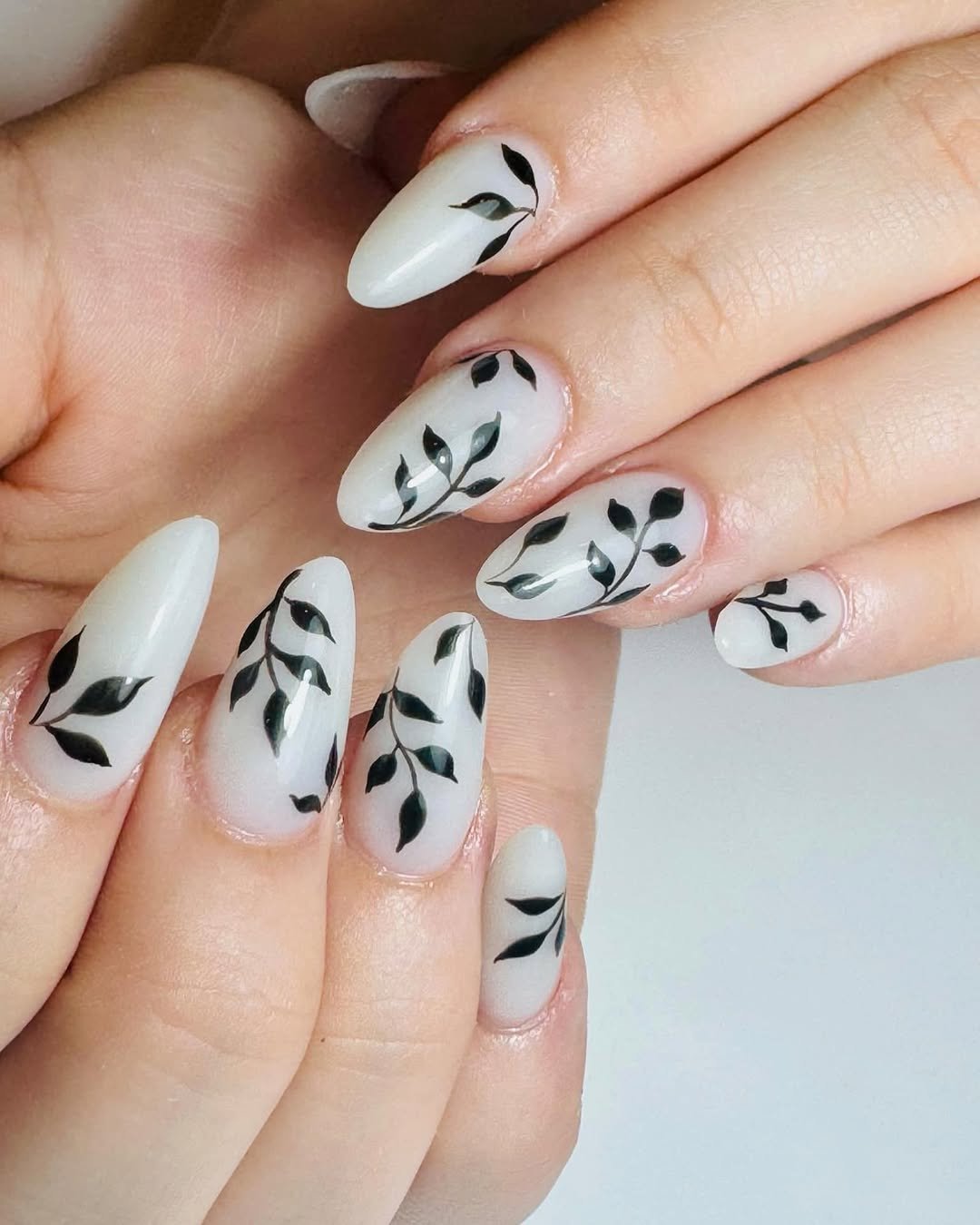 This set offers a sense of calm and refinement. A soft, milky base is adorned with delicate black leafy designs, creating a clean, fresh, and elegantly understated look.