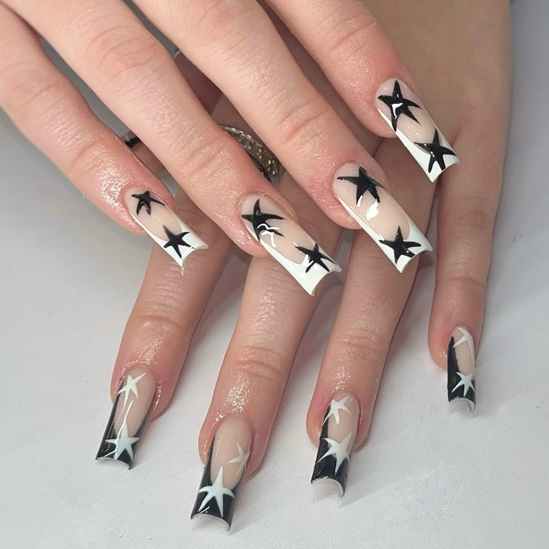 Long, sharp, and unapologetically bold, these nails are designed for maximum impact. Black and white star tips create a striking contrast against the nude base, immediately drawing the eye.