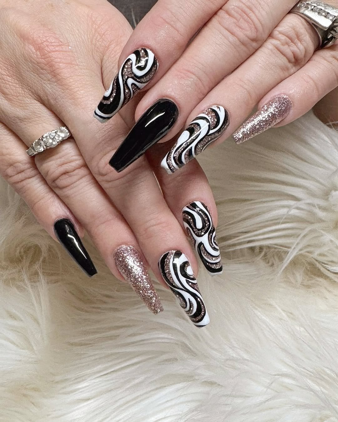 This design skillfully blends soft glamour with playful elements. Black and white swirls add a sense of movement, while glitter accent nails provide a captivating sparkle that catches the light beautifully.