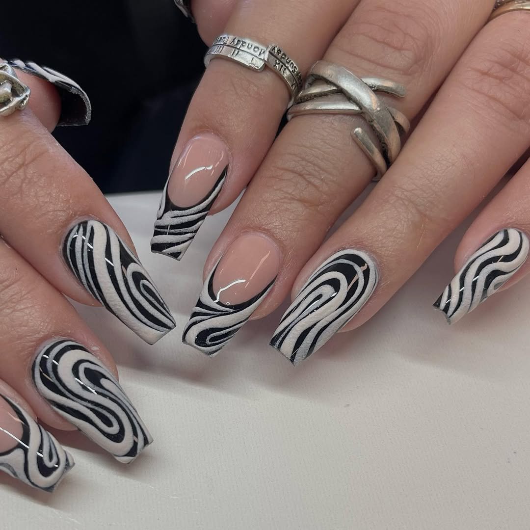 This set features a dynamic zebra pattern rendered with a fluid, softer interpretation. The black and white lines create an almost hypnotic flow across each nail.