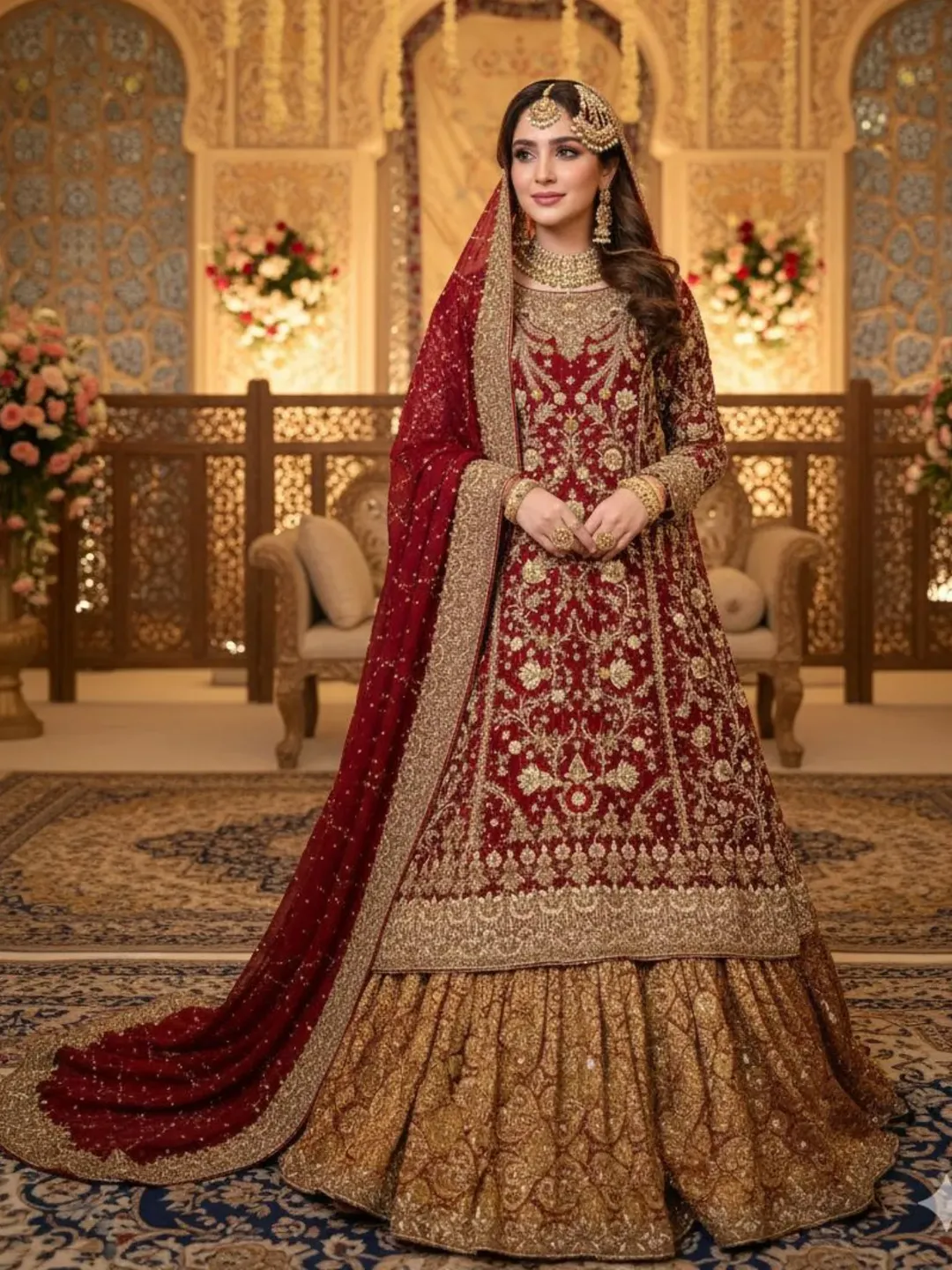 This design presents bridal red with a distinct romantic touch. The detailed gold embroidery, set against a lush backdrop, imbues the entire look with vibrancy and festivity. It feels intricate yet airy.