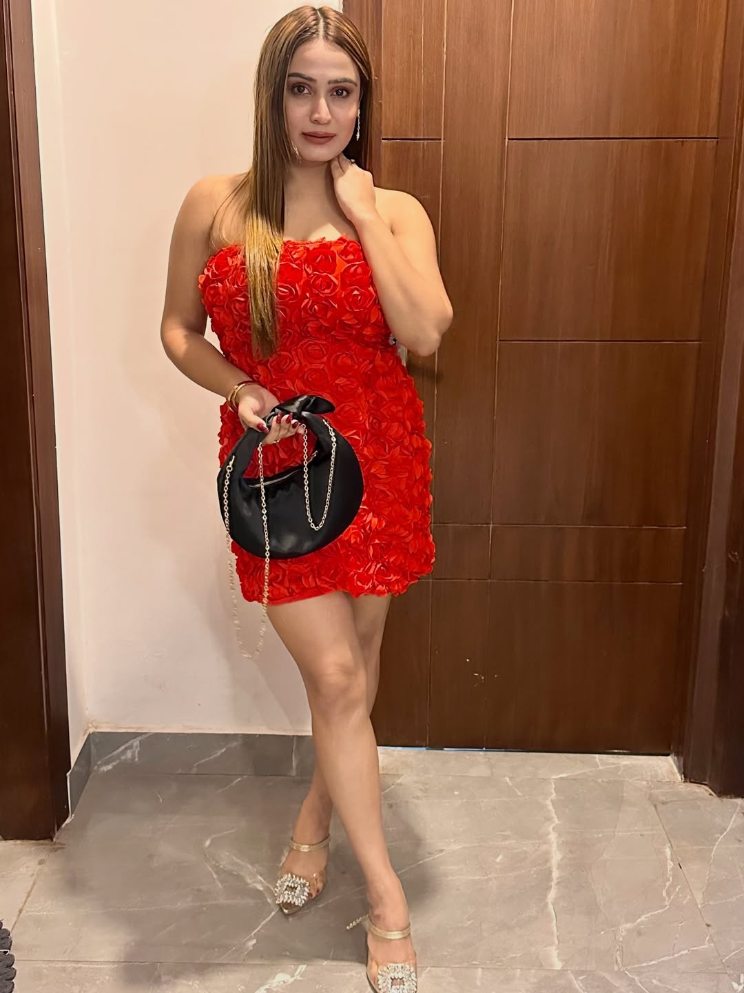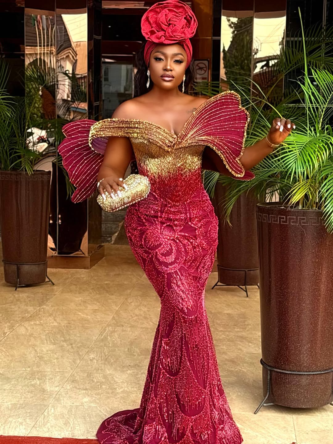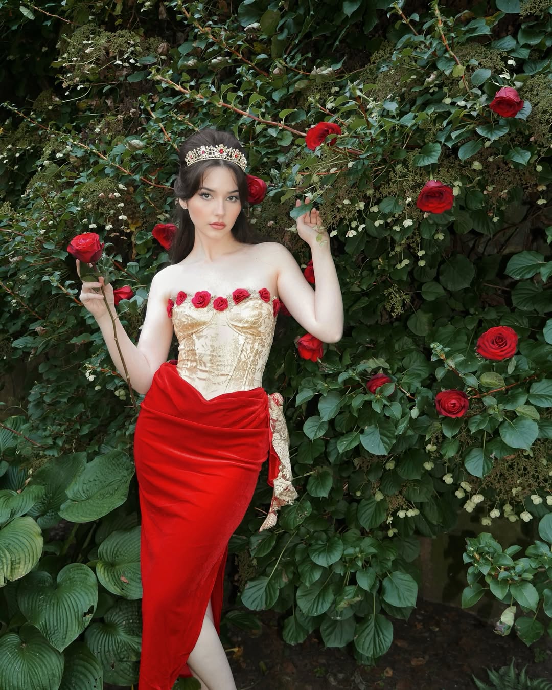This red-and-gold ensemble offers a modern, cinematic feel, reminiscent of a captured red-carpet moment. The metallic gold tones brilliantly reflect light, while the red anchors the look with a sense of sultriness.