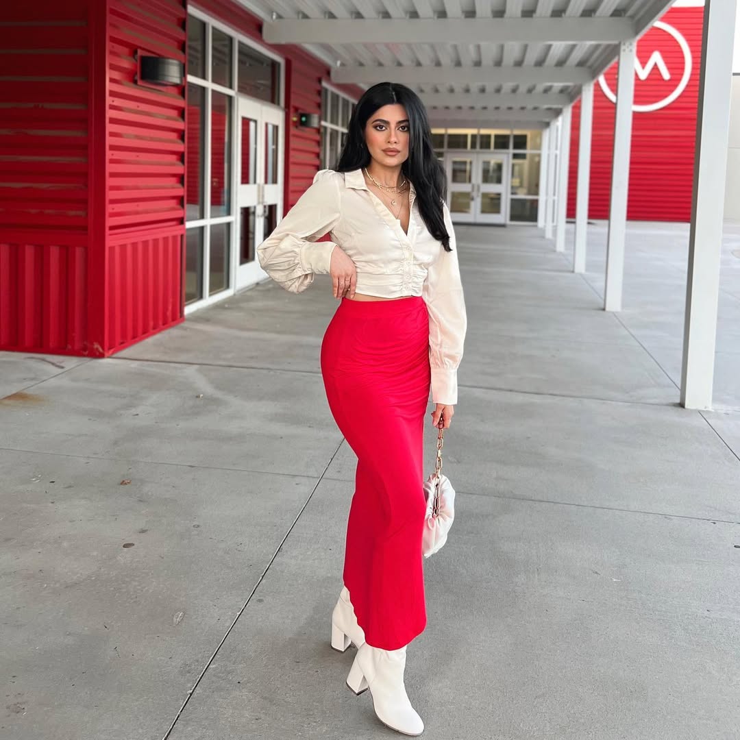 This outfit achieves a perfect balance. A crisp, elegant top paired with a bold red skirt creates a modern, confident, and subtly powerful ensemble. It is minimalist yet engaging—the kind of look that garners attention without explicitly seeking it.