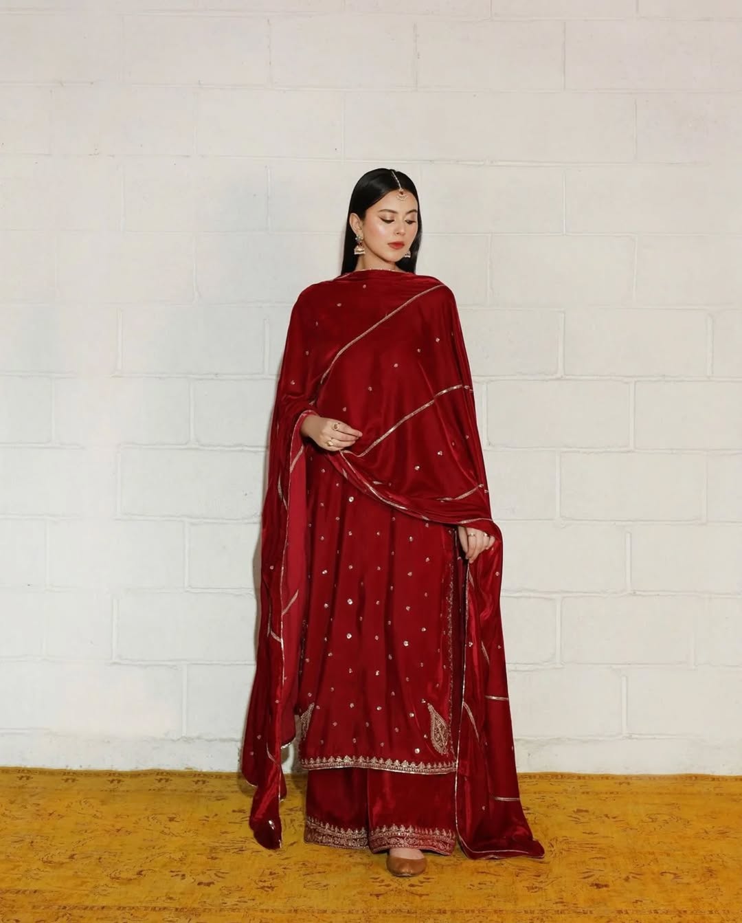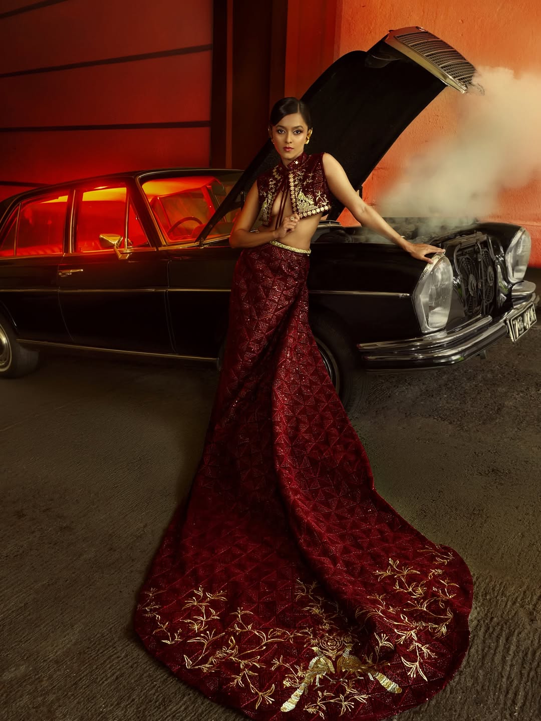 This look skillfully merges tradition with a global sensibility. The red and gold palette feels rich and ceremonial, while the styling introduces an unexpected, artistic flair.