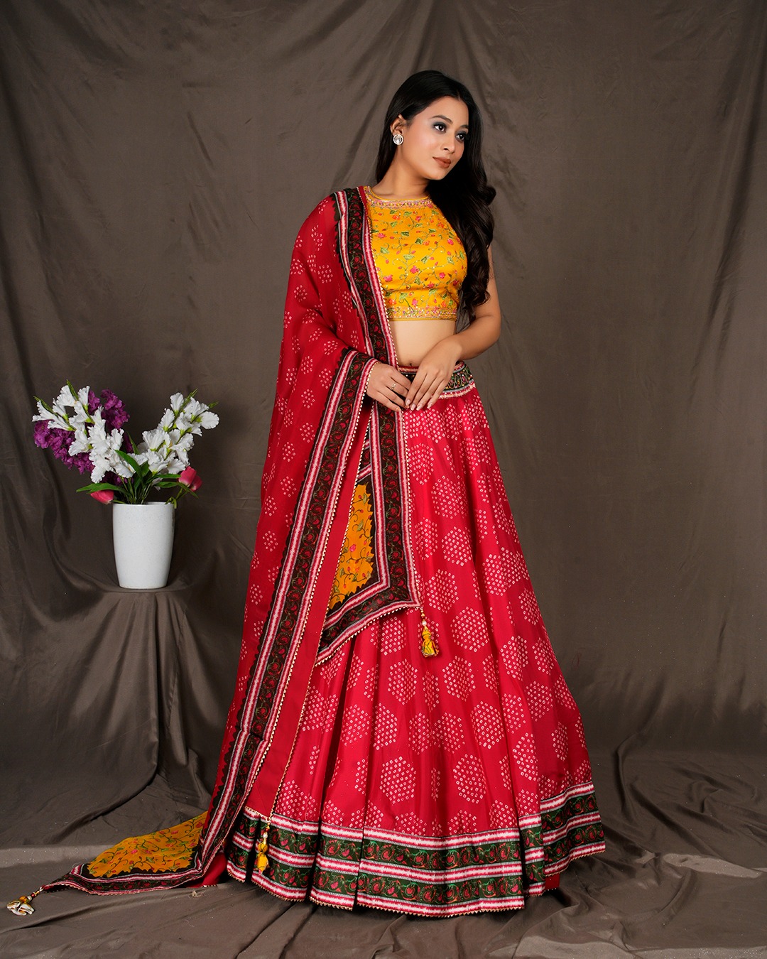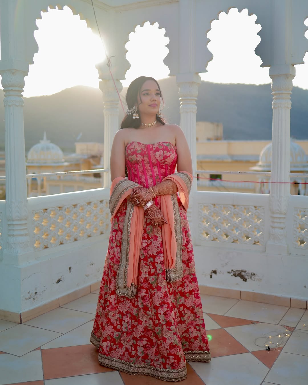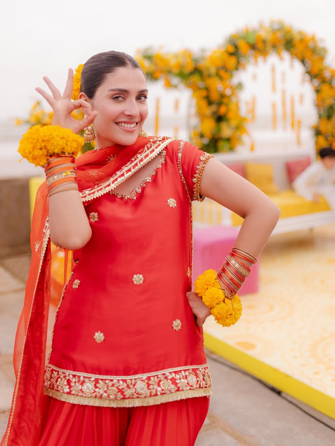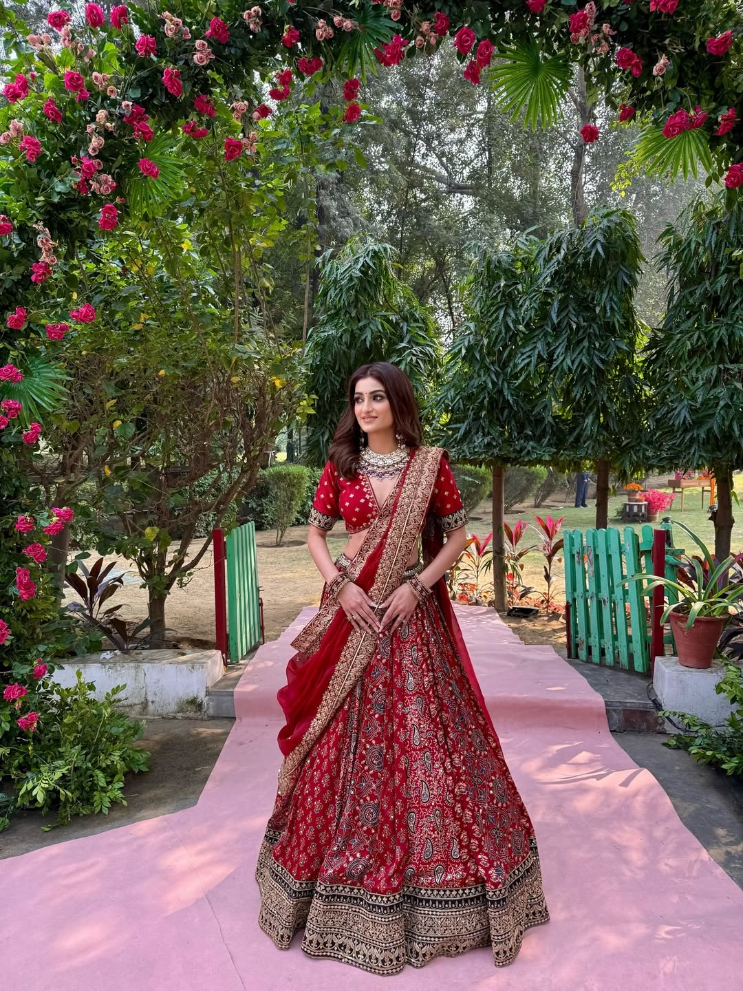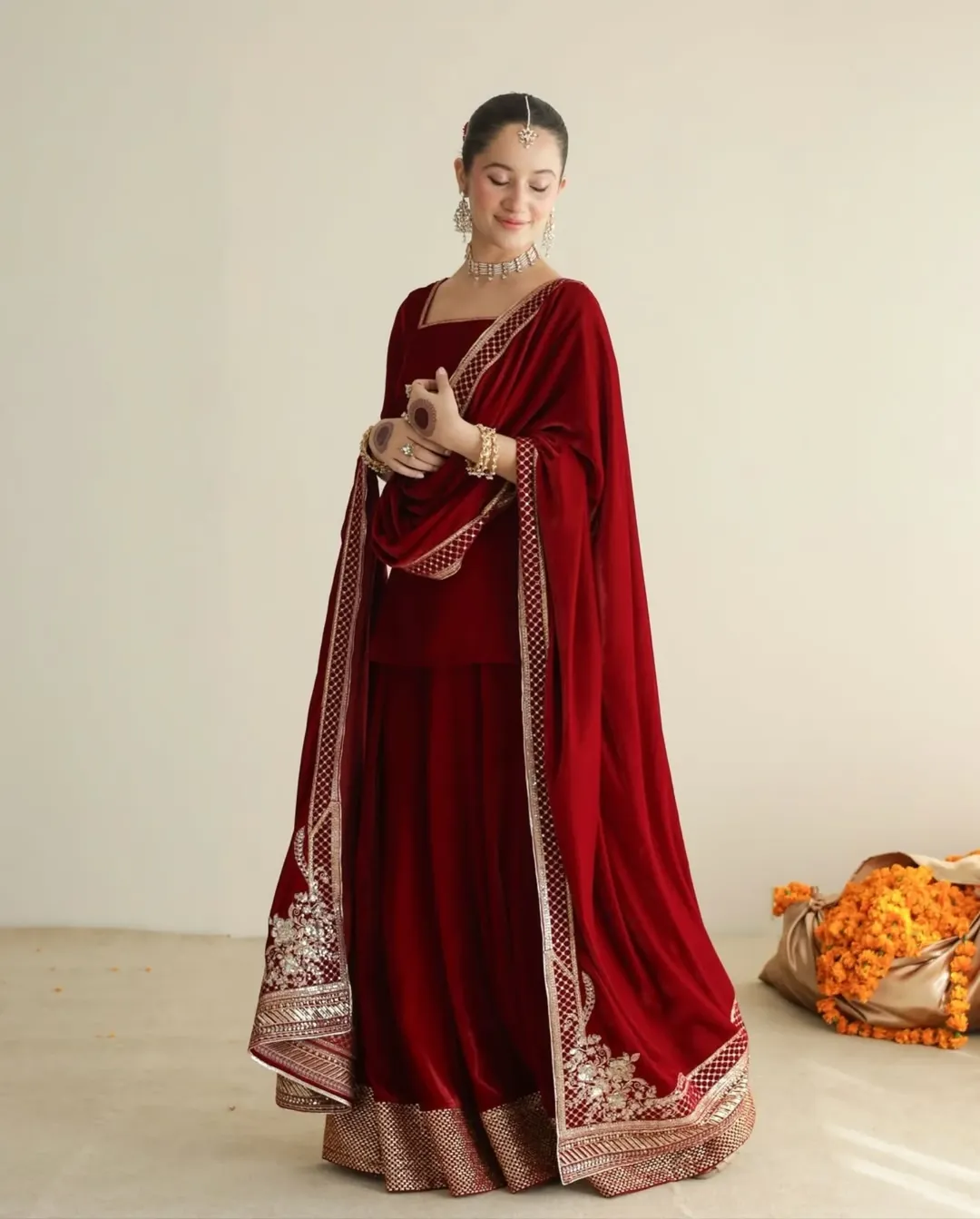 This ensemble radiates sheer happiness. The bright red tones, accented with gold, and playful styling make it an ideal choice for pre-wedding celebrations. It’s an outfit that moves in harmony with laughter and music.