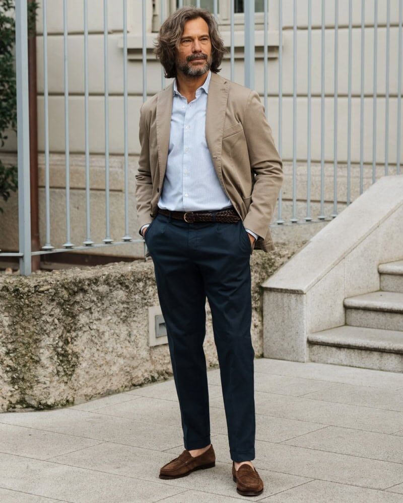 For men who dislike rigidity, an unstructured blazer is the answer. With no padding or sharp lines, it drapes naturally on your shoulders, delivering a relaxed feel. Try neutral or autumnal shades with relaxed-fit wool trousers and suede loafers. My Velasca CORBYN Tech Stretch Travel Blazer has become a favorite — it brings structure without restriction.