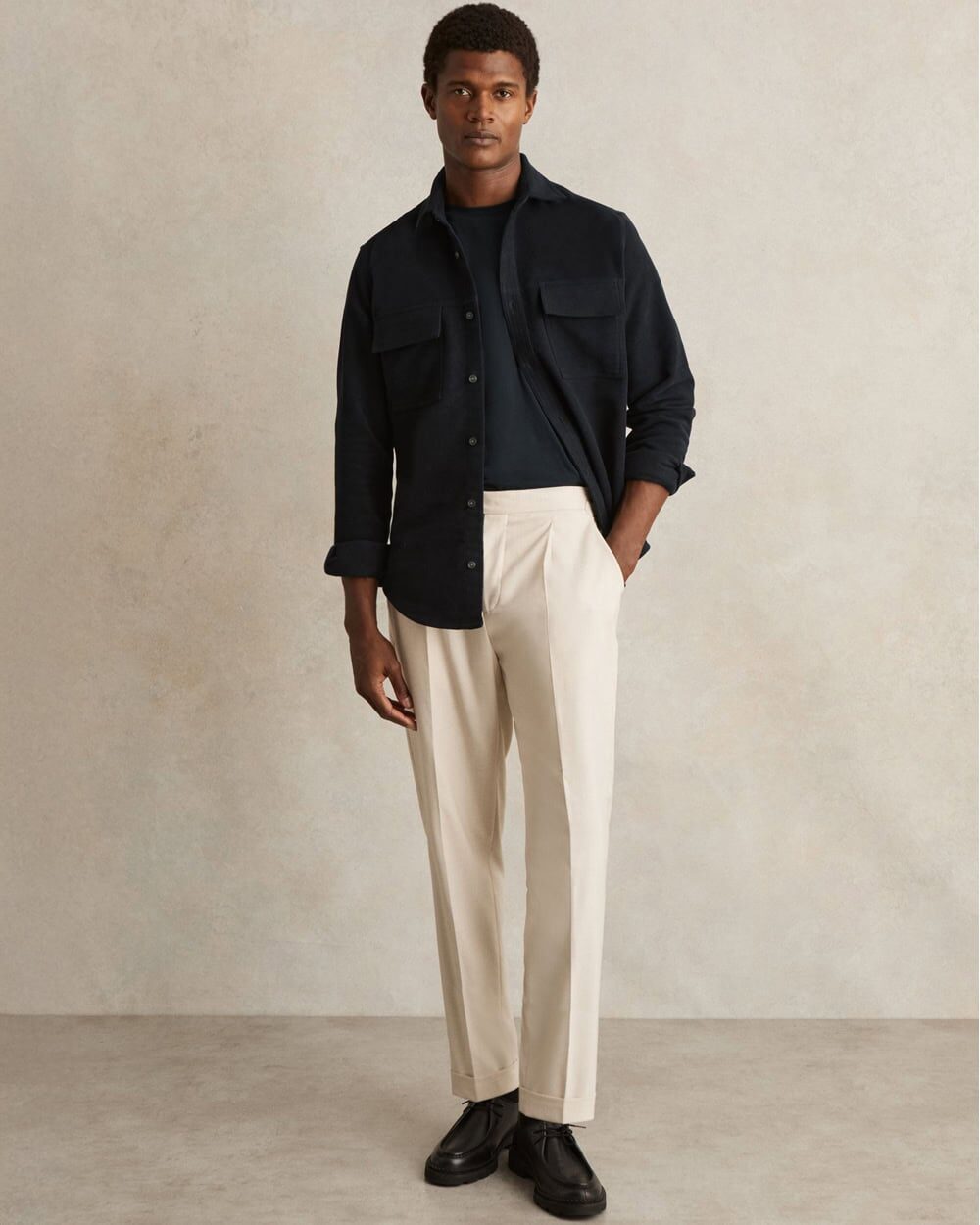 An overshirt in a cashmere-cotton blend is pure refinement. It’s soft, crease-resistant, and more luxurious than typical heavy cotton twill. The Reiss Camber Moleskin-Cotton Twin-Pocket Overshirt works perfectly with pleated pants, a tucked T-shirt, and moc-toe Derbies. It’s the new-age blazer substitute — effortlessly stylish, never uptight.