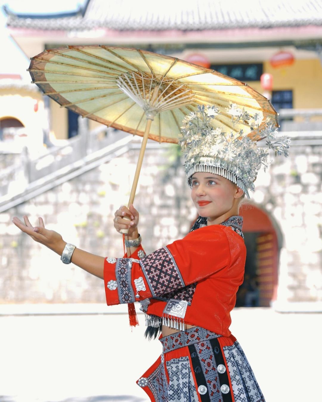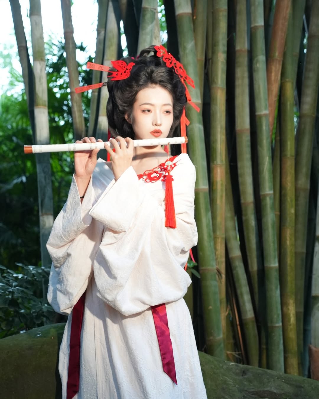 Set against a natural backdrop, this look feels almost lyrical. The white fabric contrasted with red accents creates a beautiful, pure, and symbolic balance.