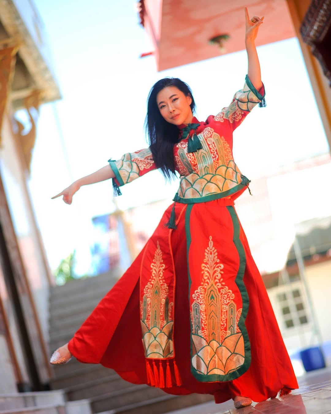 This attire feels exceptionally vibrant. The striking reds and greens, paired with wide, flowing trousers, create a sense of dynamic movement even when standing still. It is playful, joyful, and boldly expressive.