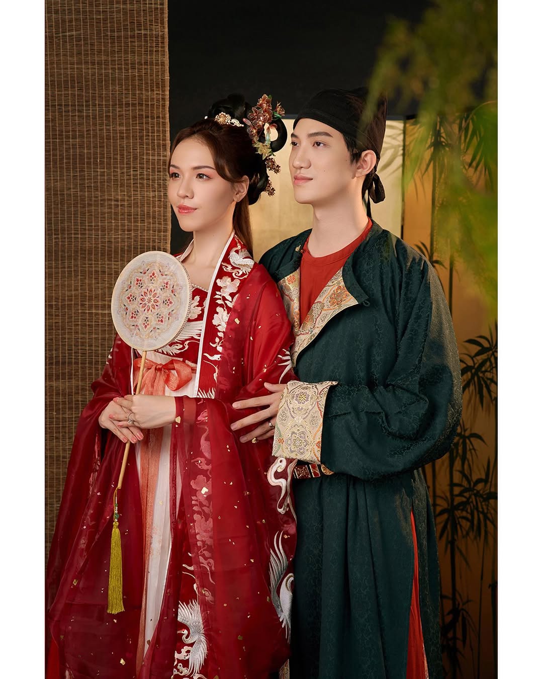 This pairing is all about narrative. Coordinated traditional attire instantly evokes a sense of era, culture, and a shared story, transforming attire into a visual scene.