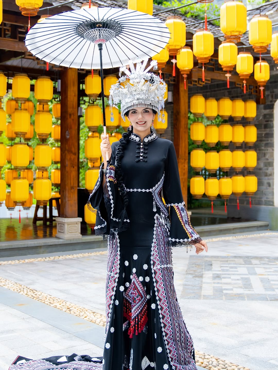 The black base combined with bold embroidery and striking headwear creates an immediate impact. The surrounding environment enhances the drama, lending the outfit a ceremonial and grand feel.