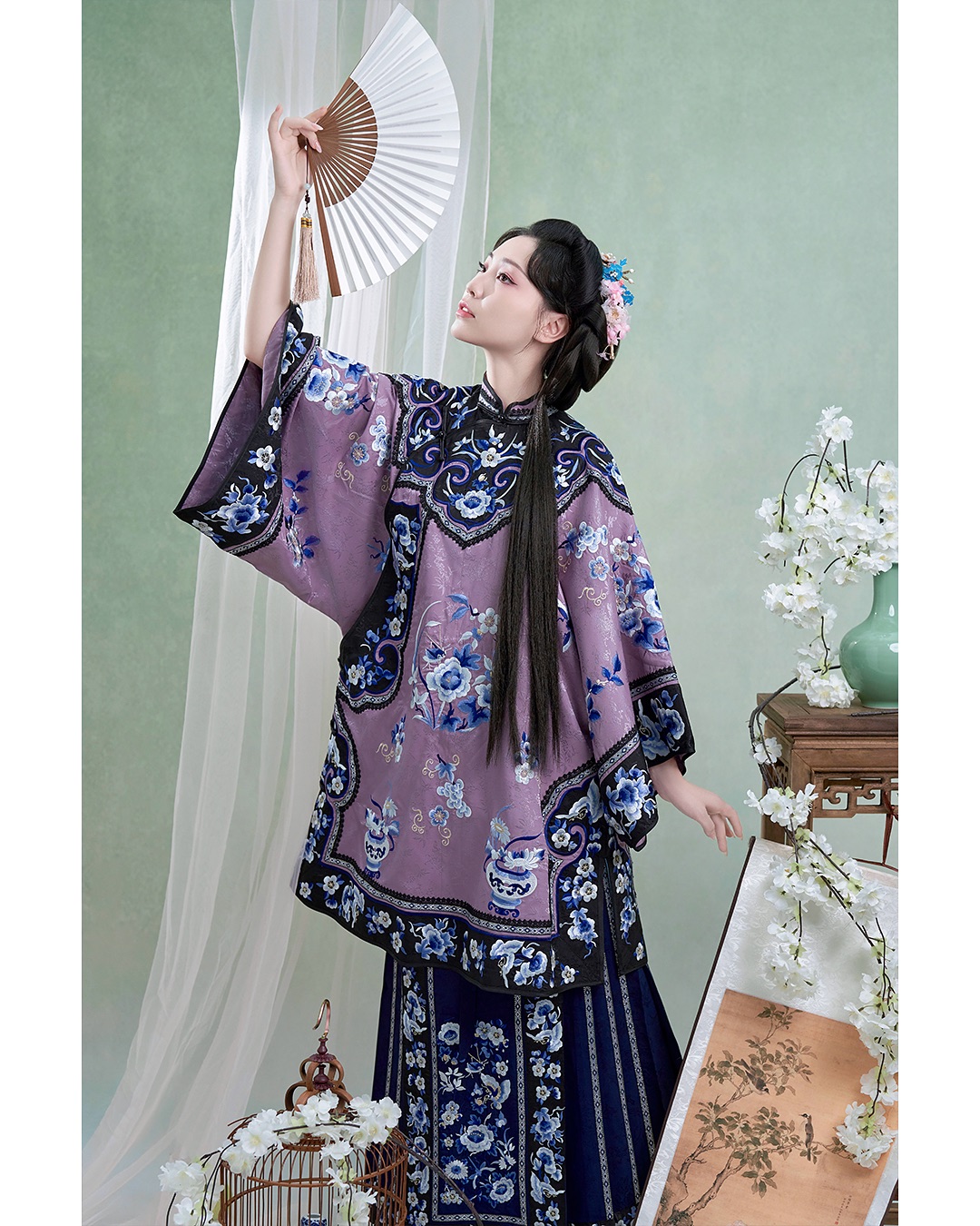 This piece strongly channels classic Chinese drama, executed beautifully. The rich purples, elaborate floral patterns, and broad sleeves contribute to a ceremonial splendor reminiscent of historical artistry.