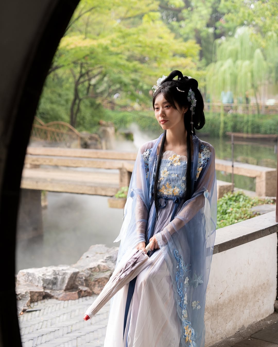 Soft pastels, delicate embroidery, and a perfectly framed archway create a scene reminiscent of historical cinema. The silhouette is gentle, romantic, and exquisitely balanced.