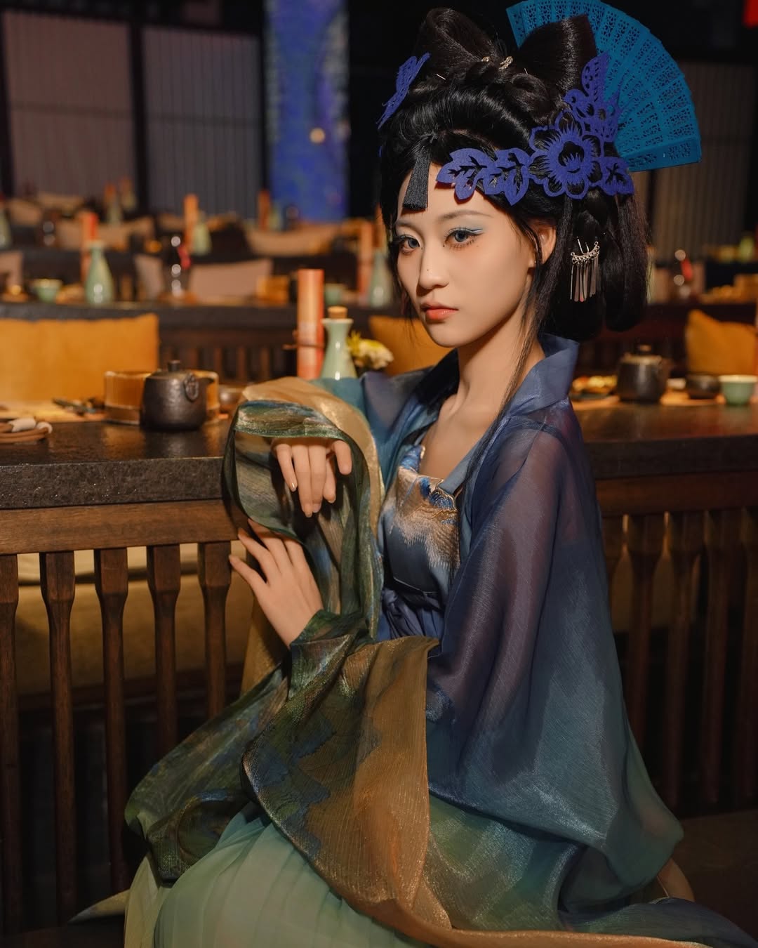 Muted blues and greens, translucent layers, and intricate headwear lend this ensemble a cinematic calmness. It evokes an intimate atmosphere, like a quiet moment captured between conversations.