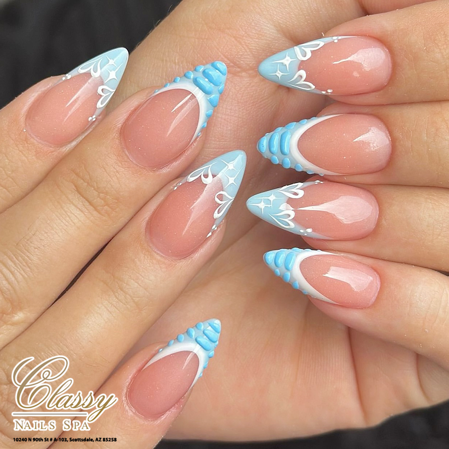 Delicate, soft, and surprisingly sophisticated, these pale blue tips adorned with tiny heart accents offer a romantic touch without being overly saccharine. The nude base grounds the design, ensuring an elegant overall effect.