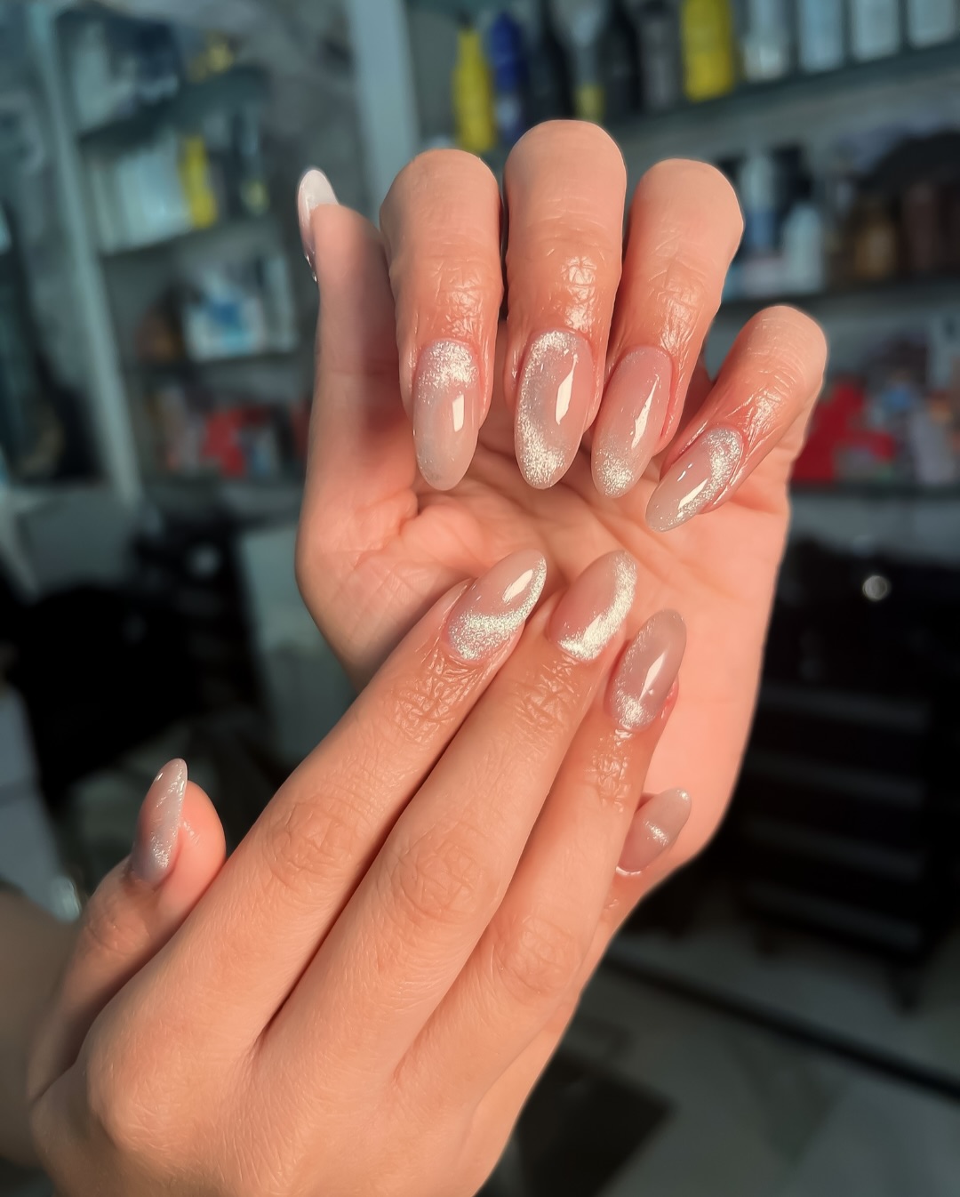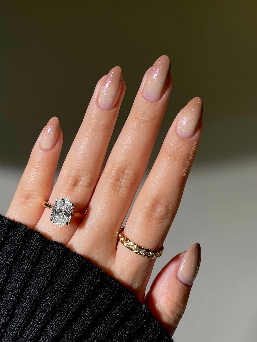 These nails epitomize understated luxury. The sheer nude base paired with a delicate shimmer creates an almost airbrushed effect, lending the hands a naturally refined glow.