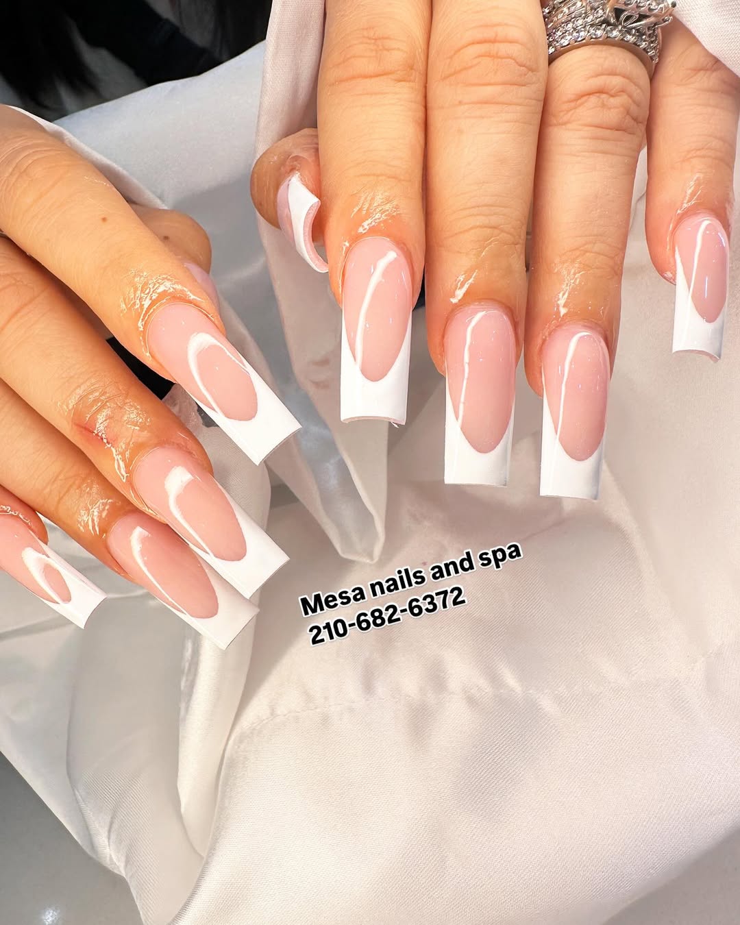 This rendition of the French tip exudes ultimate confidence. Clean blush bases, sharp white tips, and a long square shape convey a sense of purpose. It’s a classic design infused with a modern edge that feels highly contemporary.