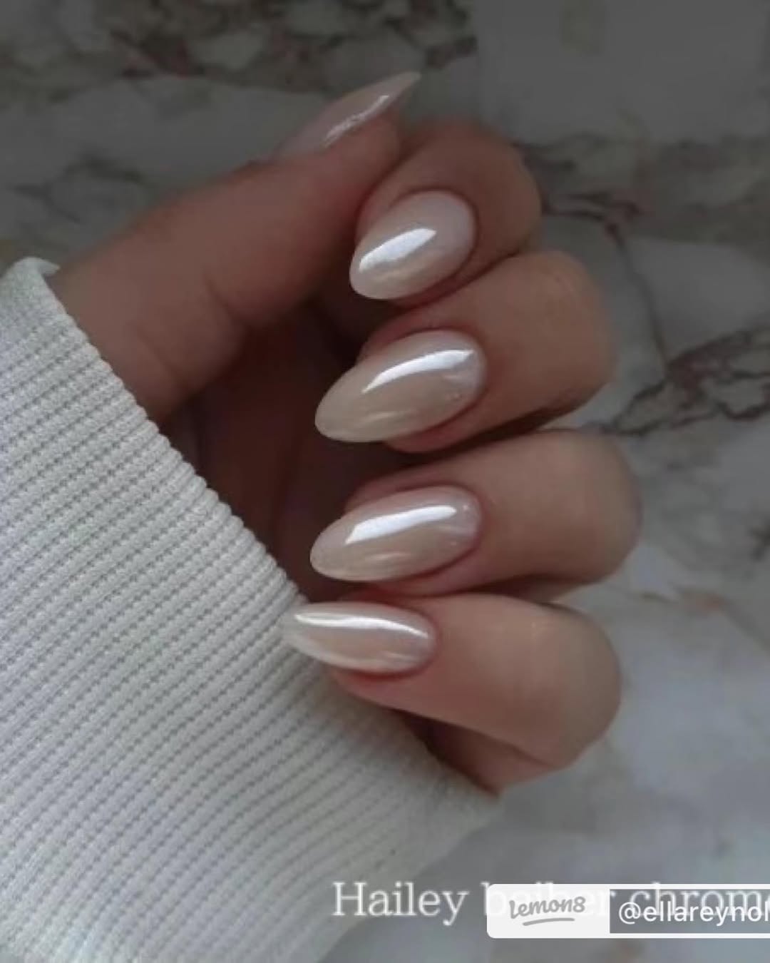 This gentle nude shade with a delicate shimmer embodies pure elegance. Its finish appears clean, fresh, and effortlessly luxurious, creating the illusion of naturally enhanced nails. The almond shape contributes to its feminine appeal, while the subtle sheen adds just enough visual interest.