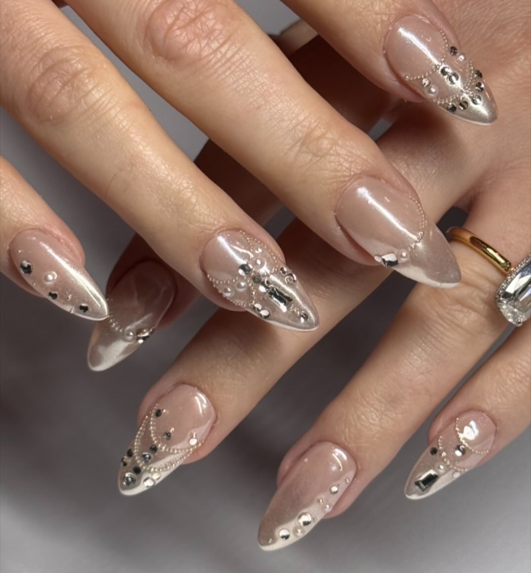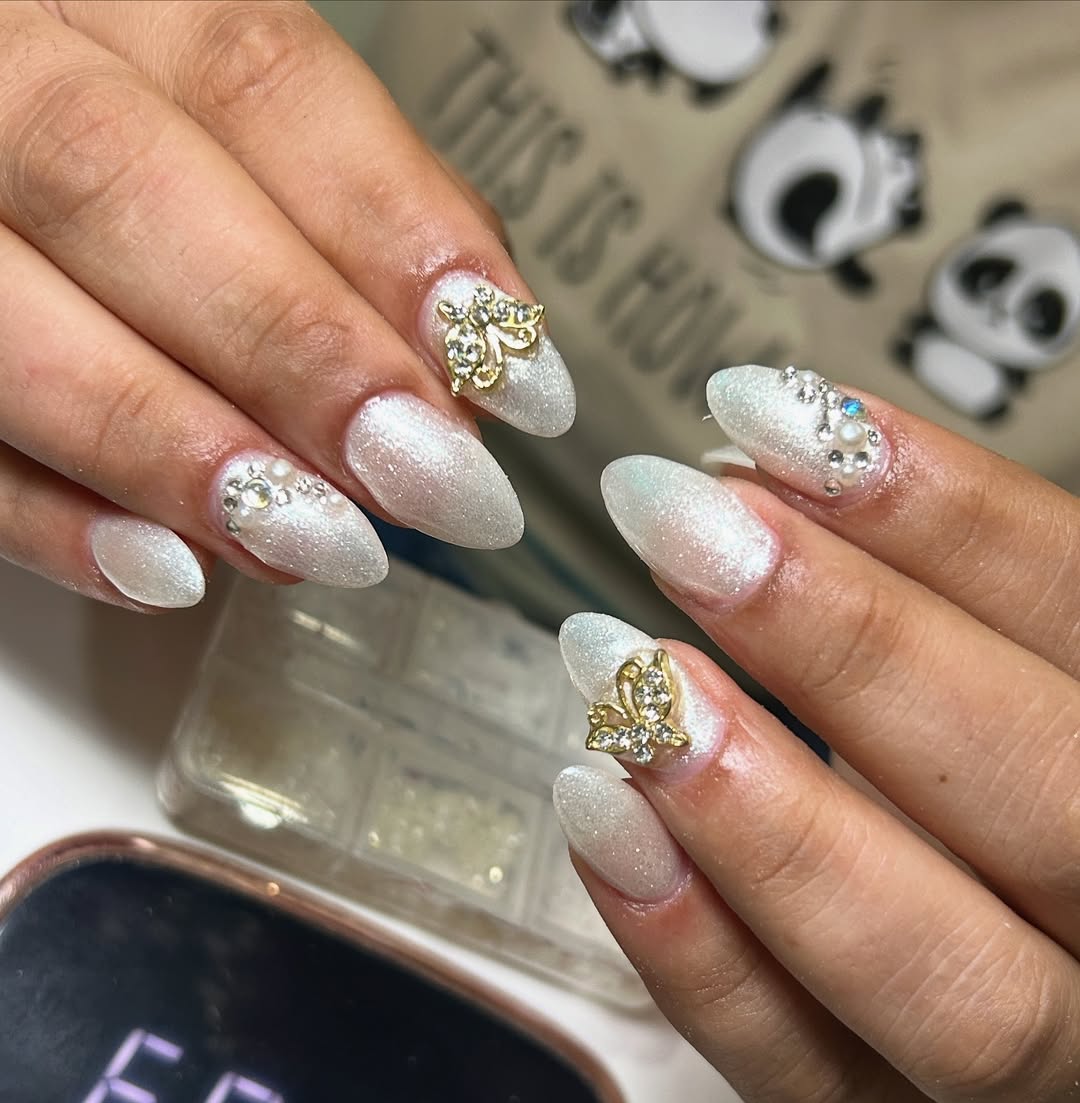 These nails embody winter luxury in a single set. A frosty, shimmering base adorned with delicate crystal placements evokes fairytale enchantment—soft, sparkling, and subtly magical.