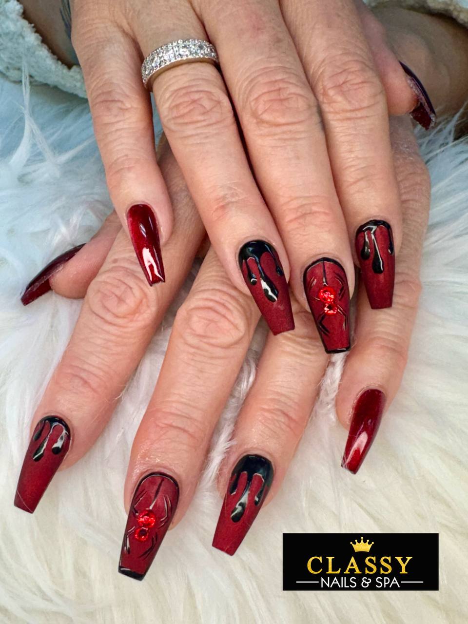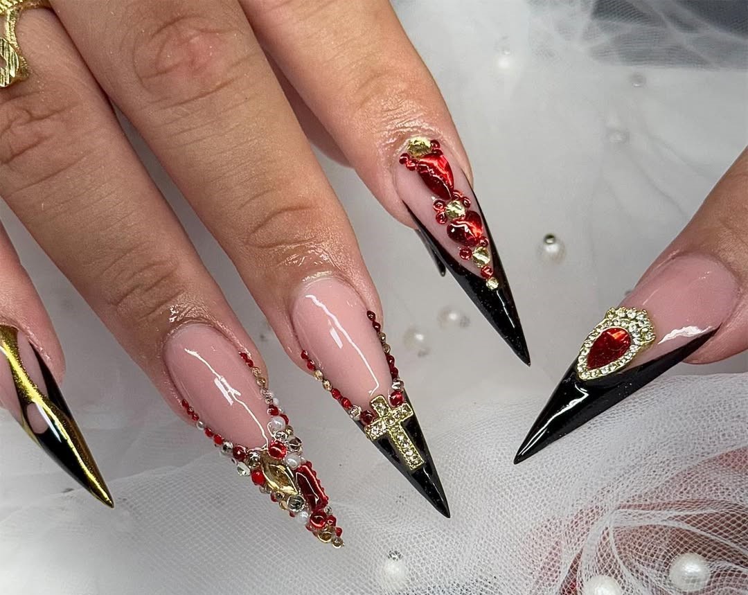 Intense red shades complemented by glossy black accents create a bold and confident finish. These nails exude power and luxury, particularly with their sculpted length and sharp details.