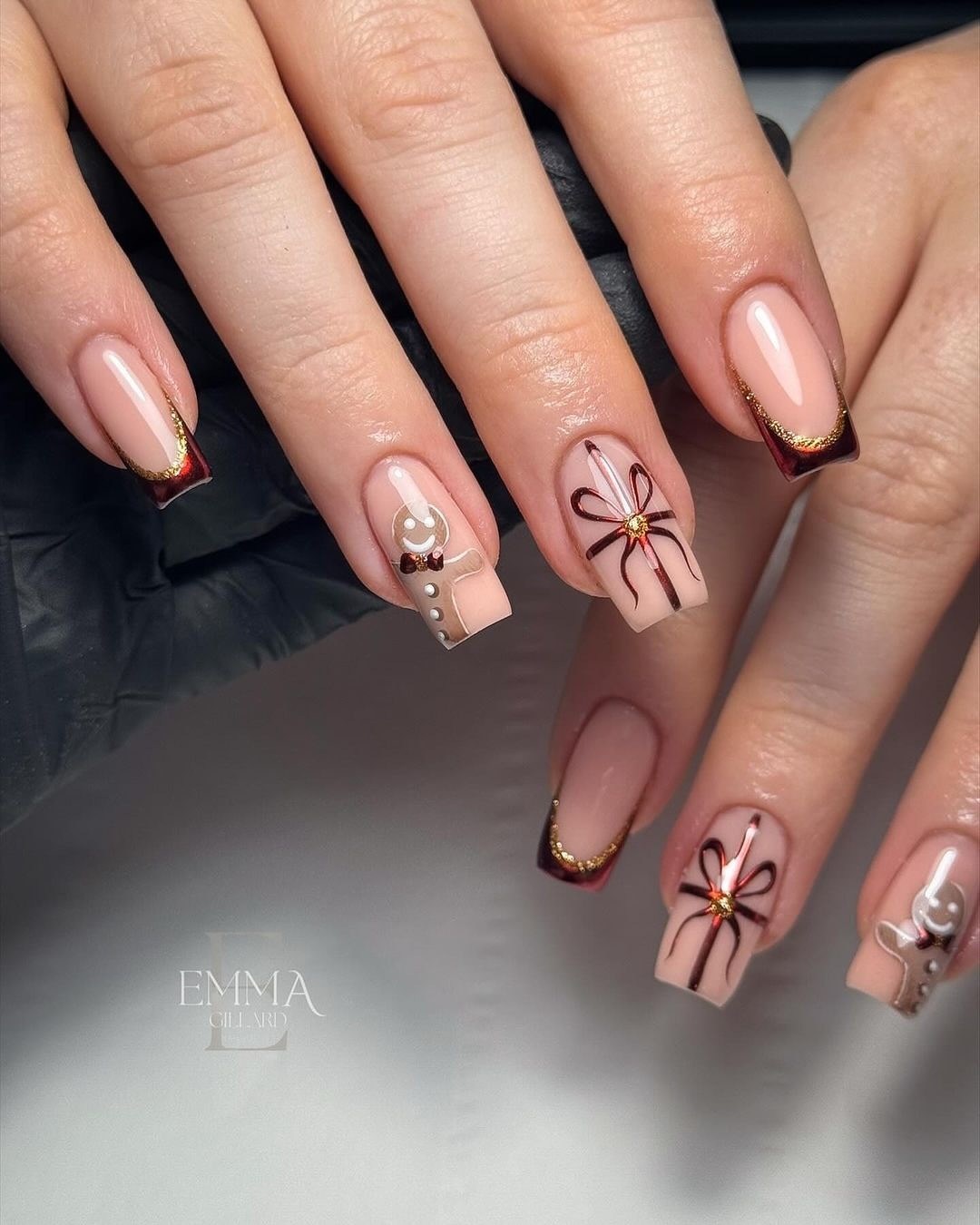 This playful French design merges nude tones with chocolate accents, bows, and a charming gingerbread motif, creating a look that is both festive and refined. A subtle gold border adds a touch of luxury.