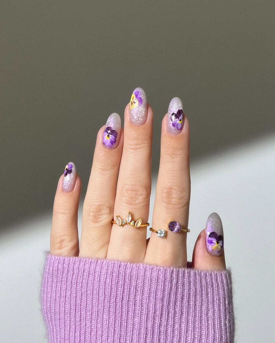 The soft lavender shimmer combined with intricate petal details evokes a dreamy, ethereal quality, reminiscent of spring captured on the fingertips. The gentle luminescence lends a fresh and youthful appearance.