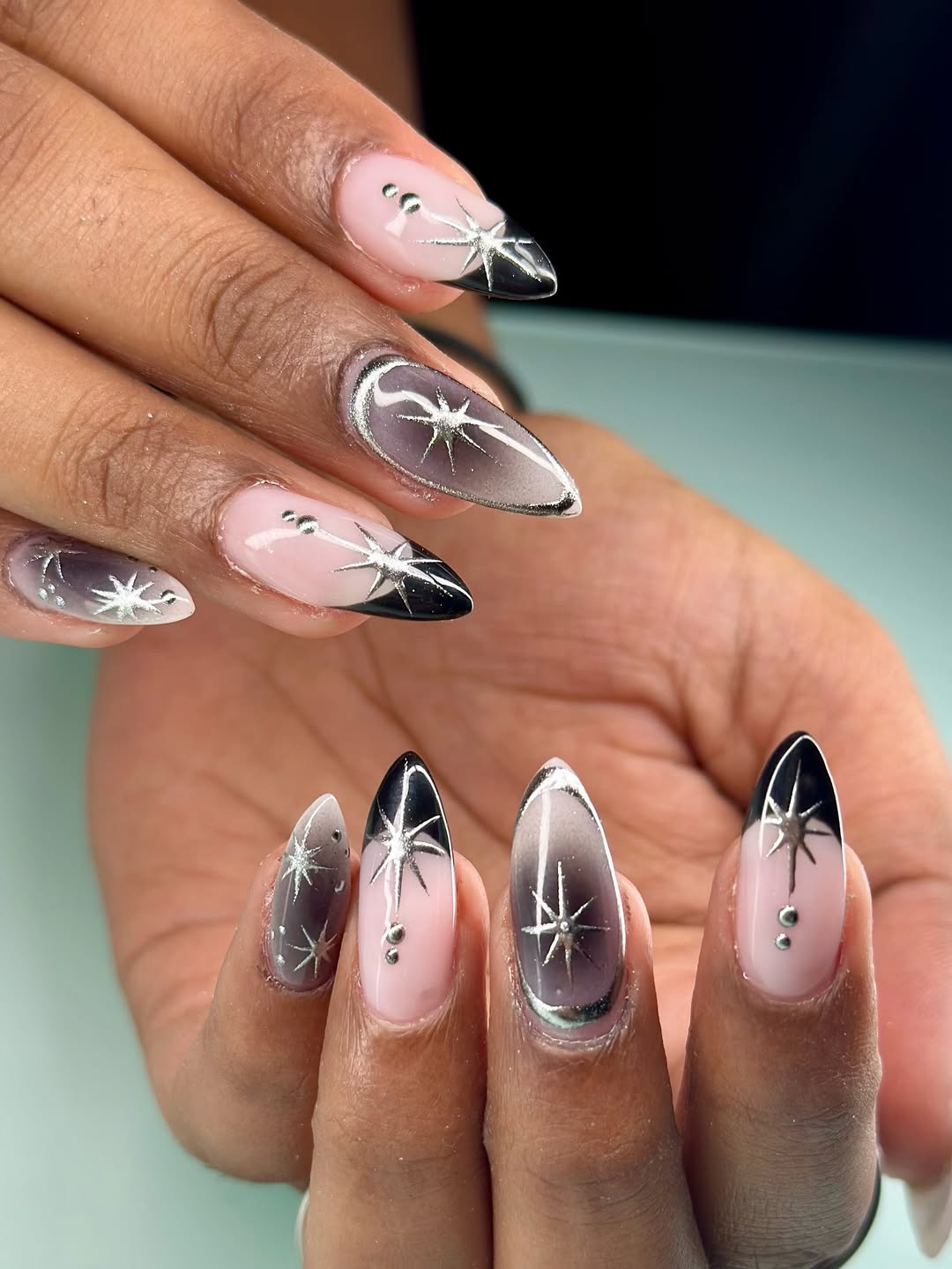 Dark tips, soft blush bases, and starburst accents combine to create a captivating night-sky effect. The contrast is bold yet not heavy, with metallic details providing an exciting shimmer.