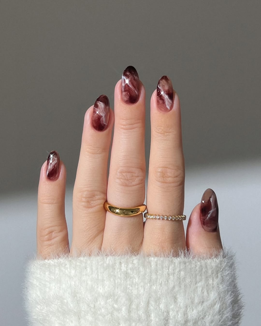 Veins of chocolate and cream create a marbled, stone-like effect on these nails. The design is earthy, modern, and surprisingly adaptable for everyday wear.