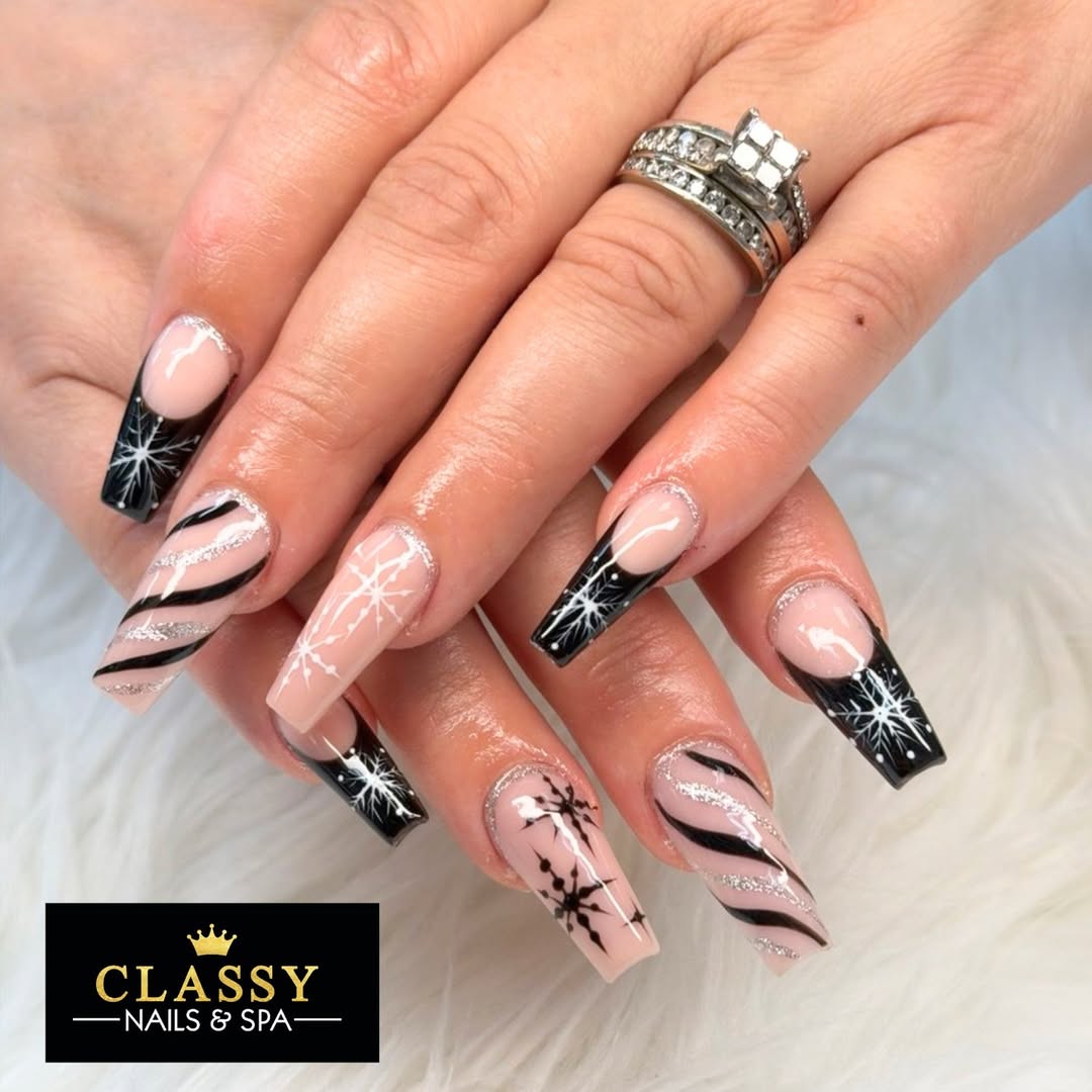 This design introduces a dramatic flair in the most exquisite manner. Sharp black tips complemented by jewel embellishments convey boldness, luxury, and an unapologetic glamour. The nude base provides a beautiful counterbalance to the entire composition.